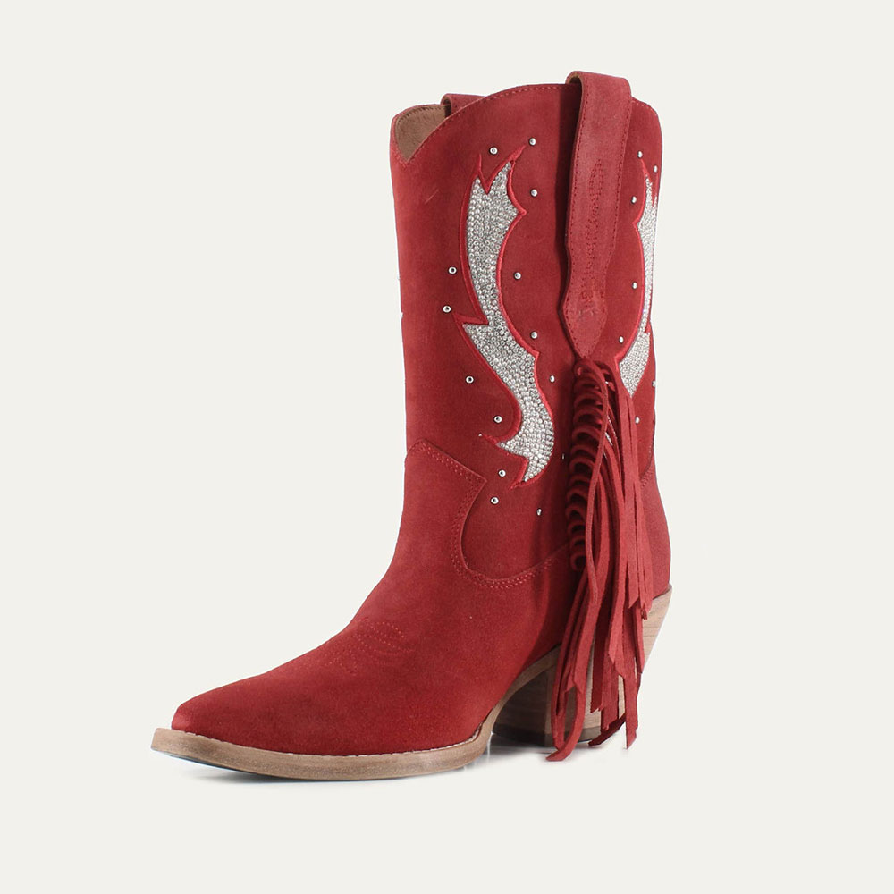 Red Vegan Suede Studded Snip Toe Rhinestone Wide Calf Cowgirl Boots