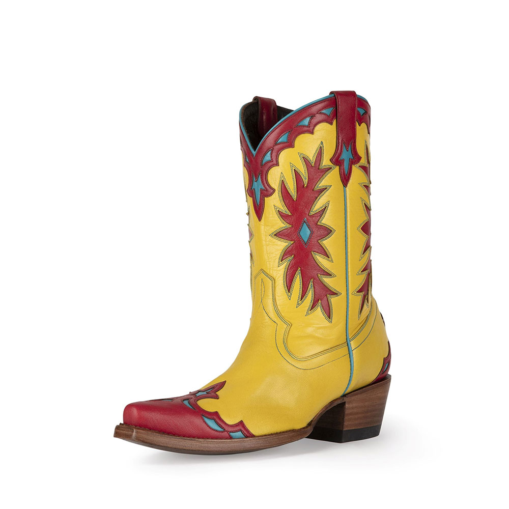 Red & Yellow Stacked Heel Decorative Inlay Wide Calf Cowgirl Boots