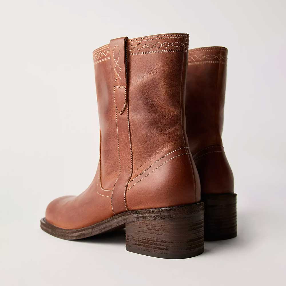 Retro Tan Mid Block Heel Pull On Ankle Square Toe Boots Women