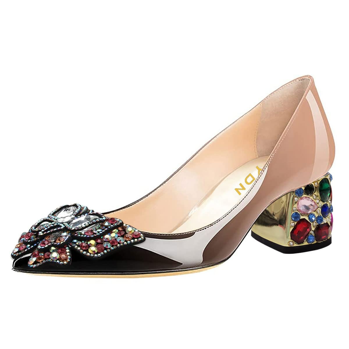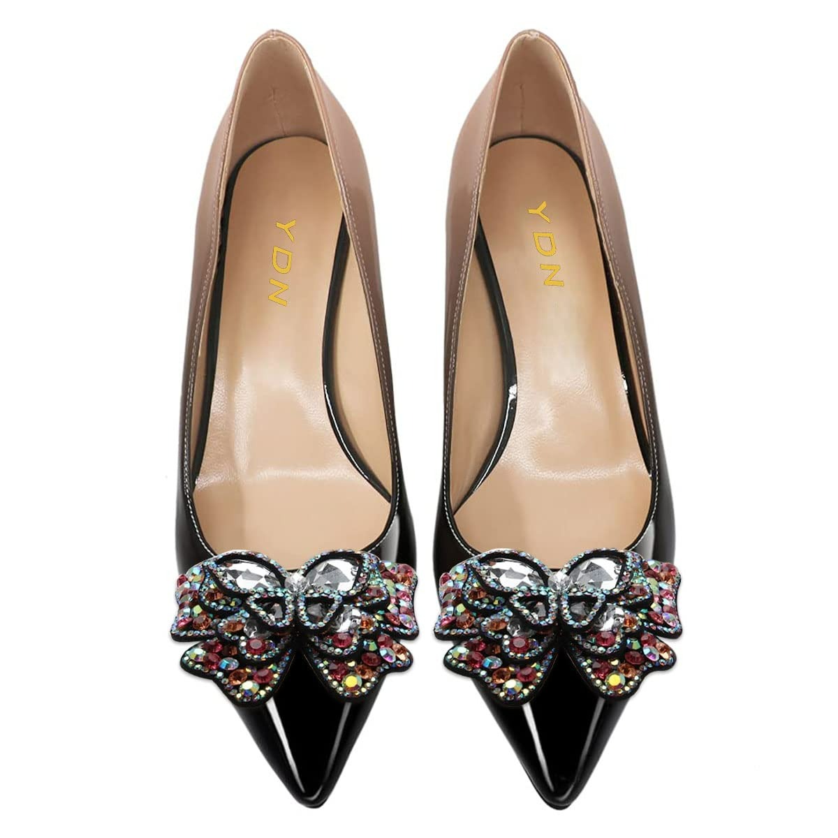 • Special Designs: The pumps feature a closed-toe, a front colorful rhinestone butterfly, a colorful rhinestone inlay block heel, a slip-on, and an ombre color design.