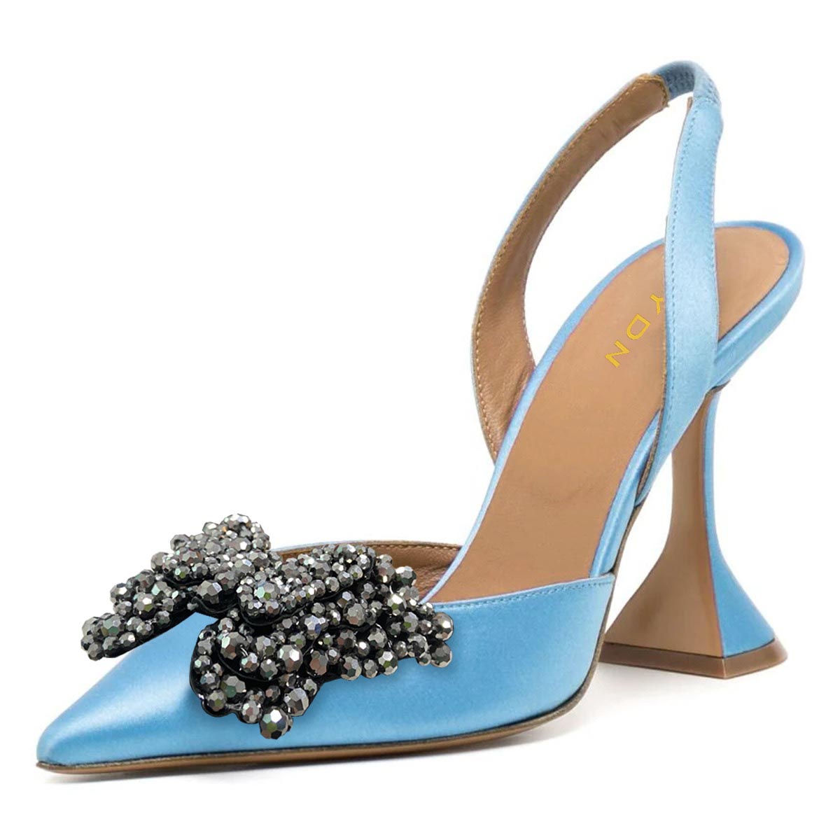 • Special Designs: These pumps feature a front rhinestone butterfly, a pointed toe, a slingback, and a slip-on style.