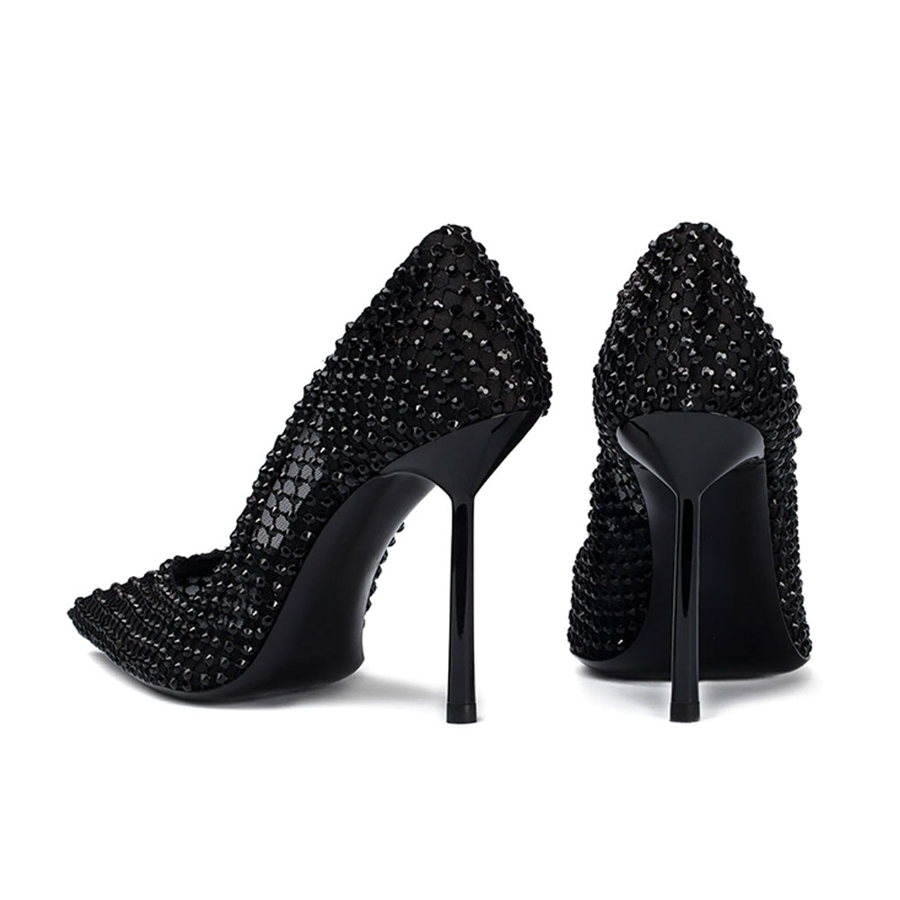 Rhinestone Studded Pointed Toe Stiletto Heel Black Pumps for Women