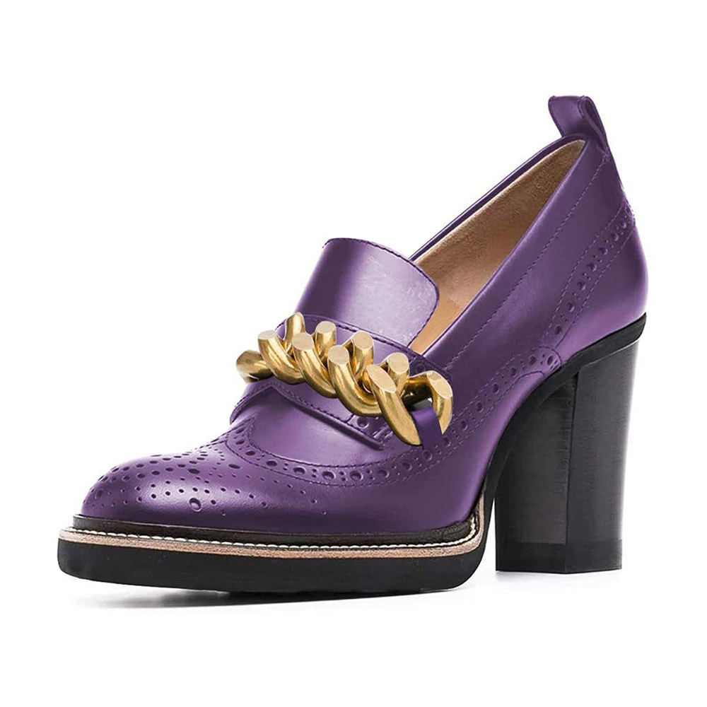 Round Toe Chain Perforated Chunky Heeled Loafers Women in Purple