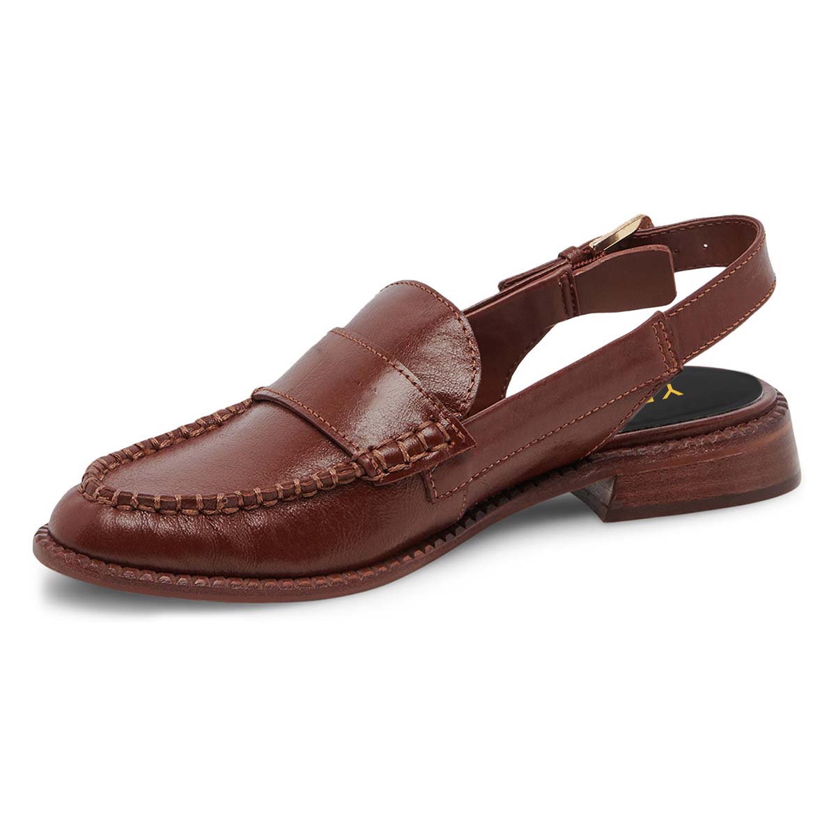 Special Designs: Dark brown loafers featuring an adjustable buckle fastening slingback pattern and slip-on convinience.