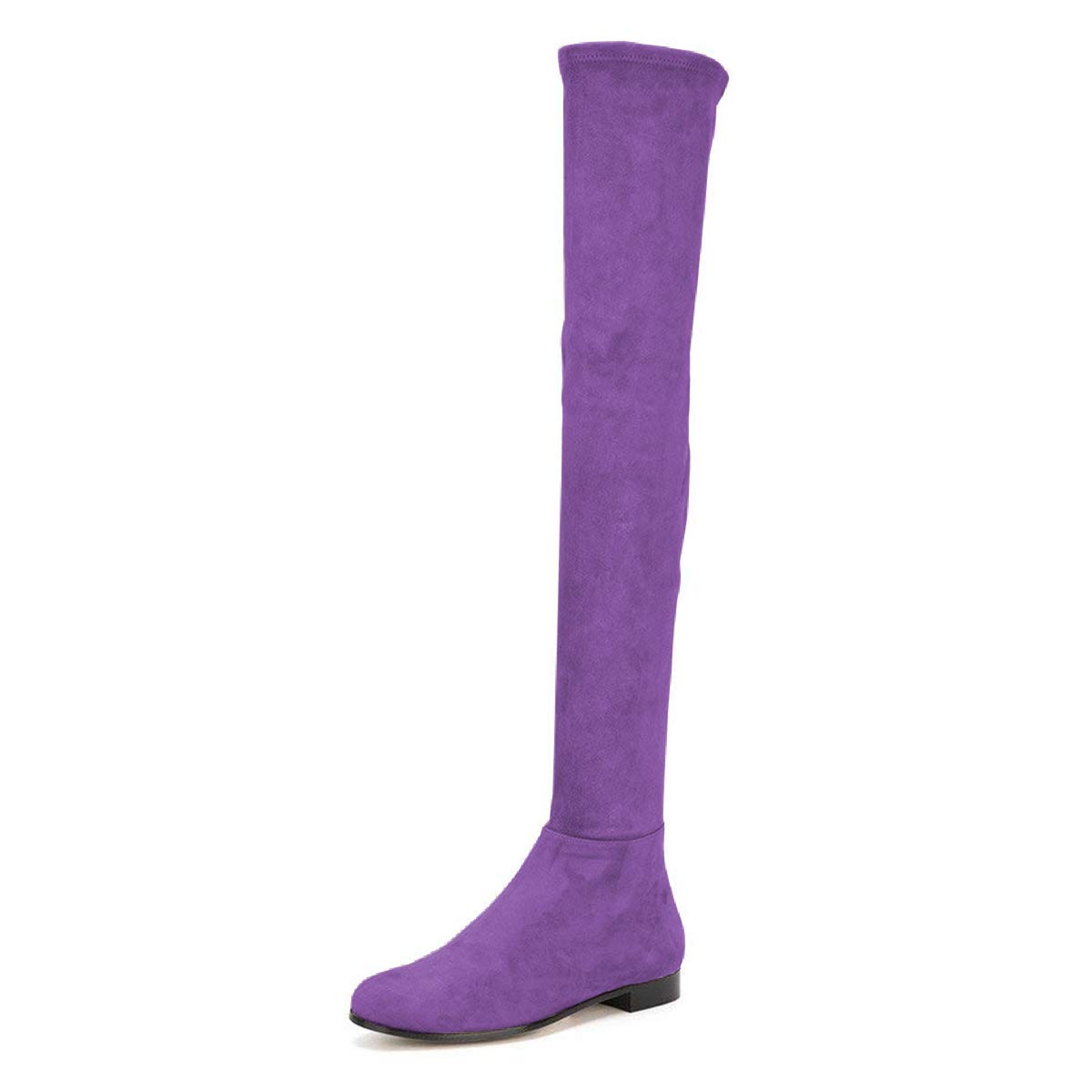 Round Toe Vegan Suede Low Heel Over The Knee Boots in Purple