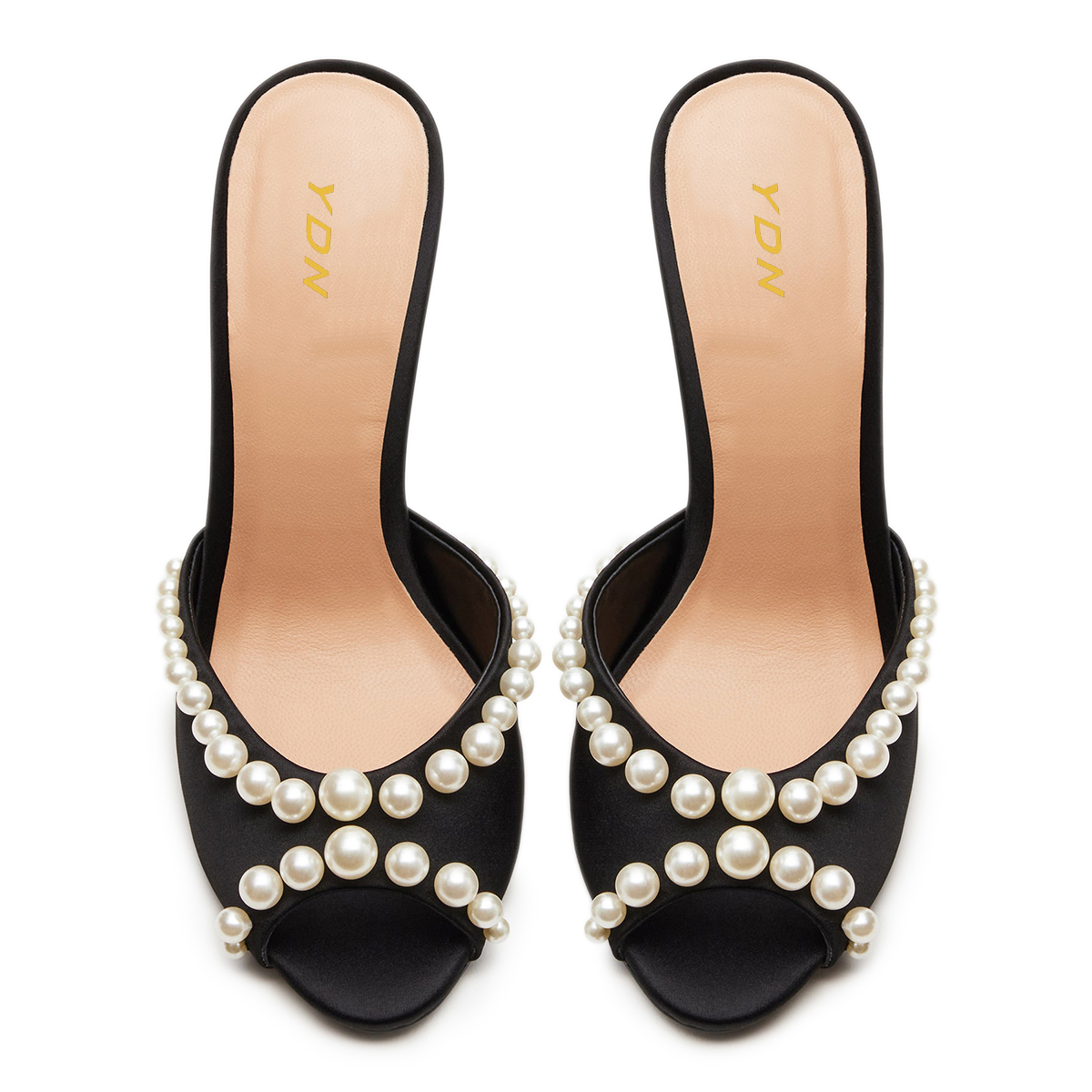• Special Designs: Black mules feature pearl embellished band and an elegant high heel.