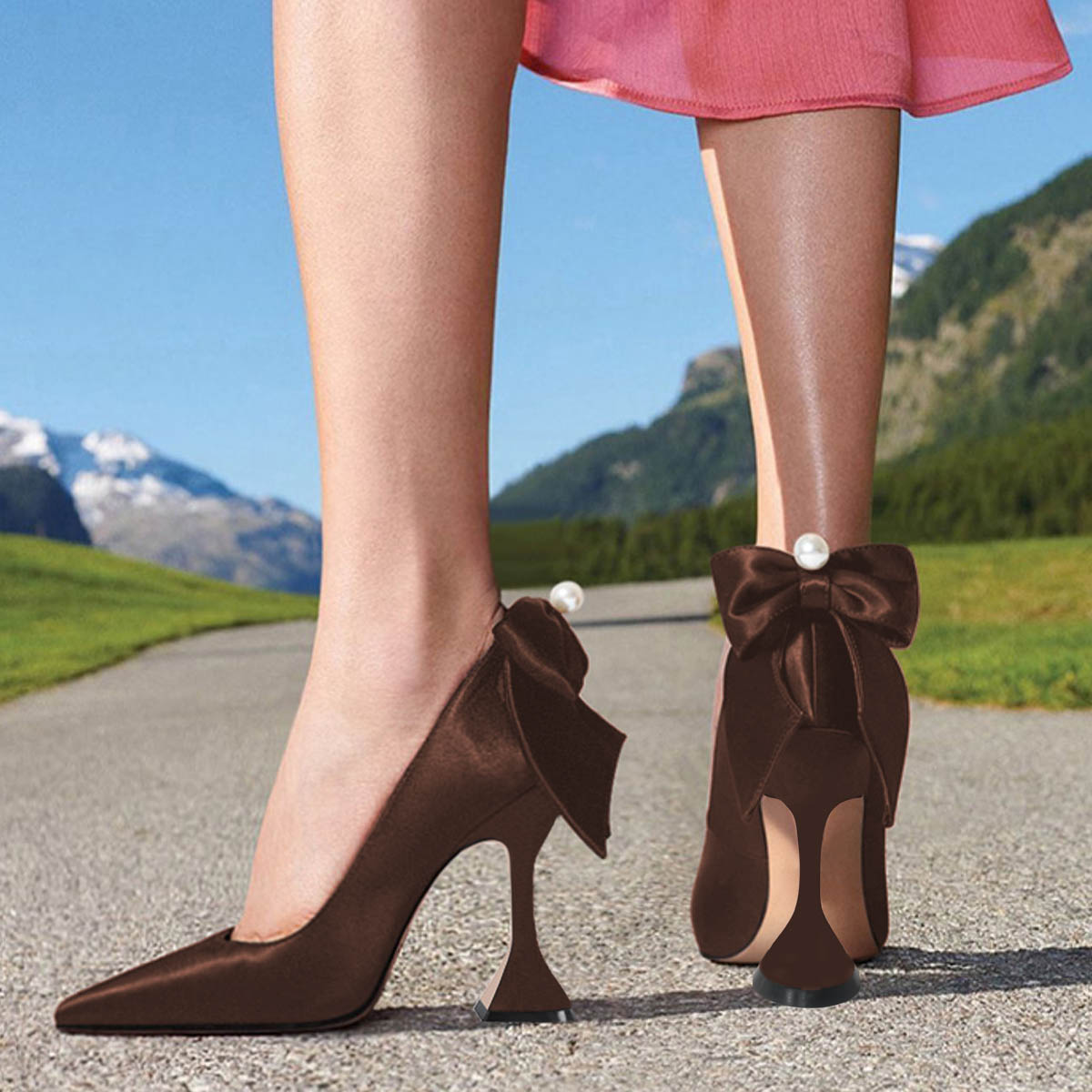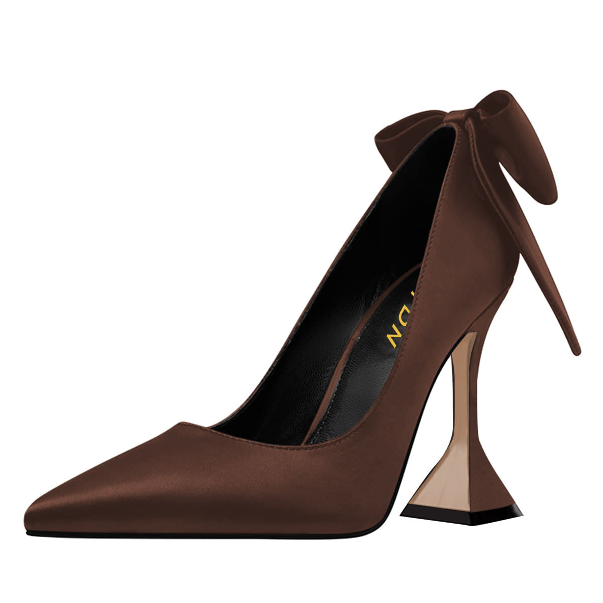 Satin Pointed Toe Flared Heel Pearl Bow Accent Pumps Shoes in Brown