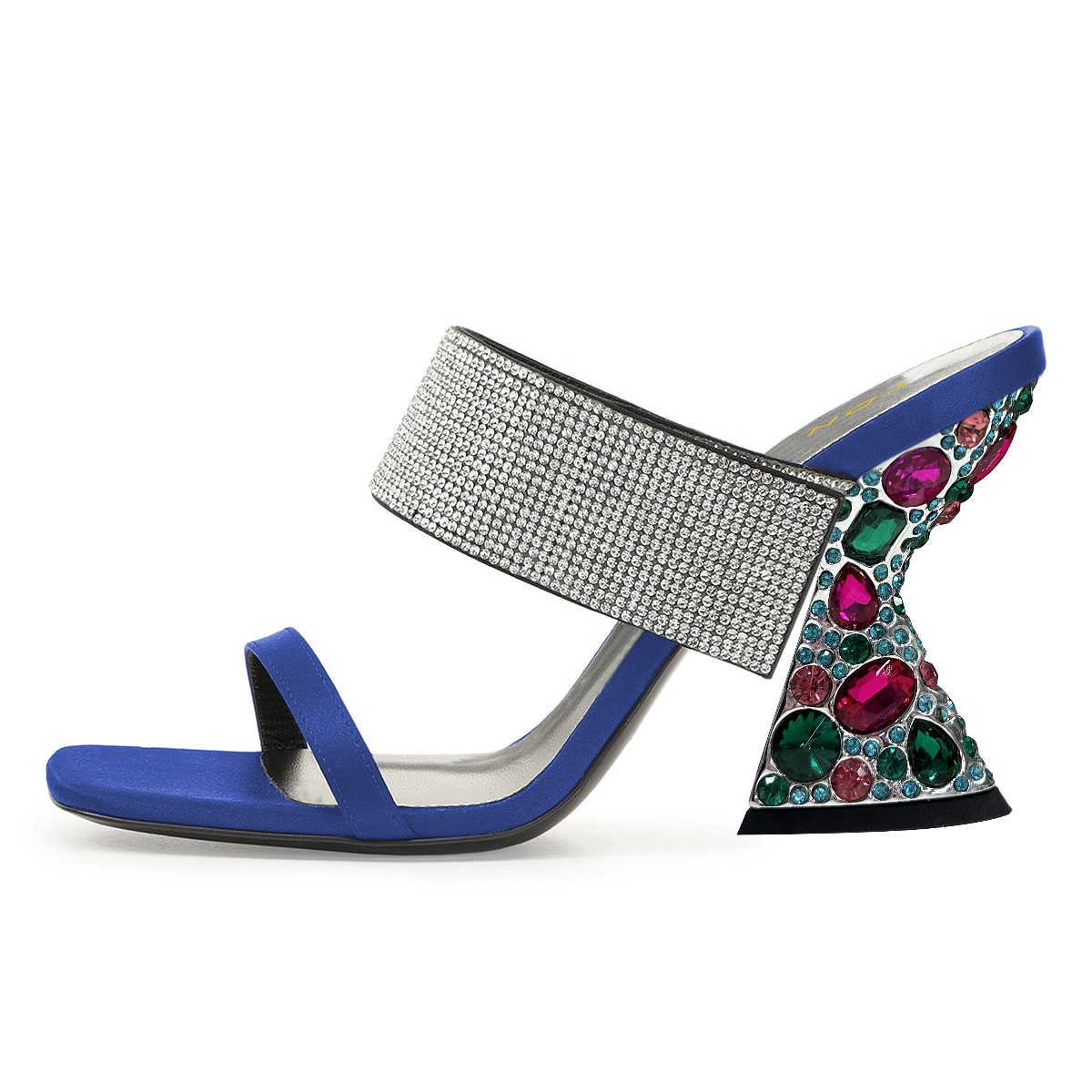 Special Designs: Blue mules feature rhinestone embellished band and a colorful elegant high heel.