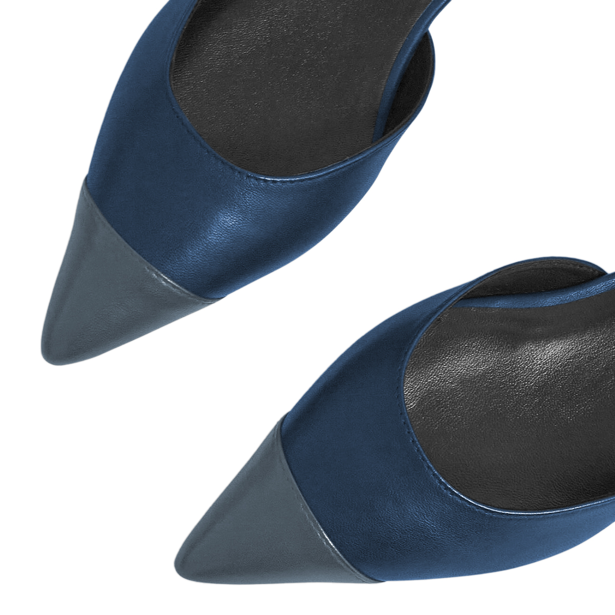 Special Designs: Blue pumps with a stylish gray pointed toe and buckle fastening strap design