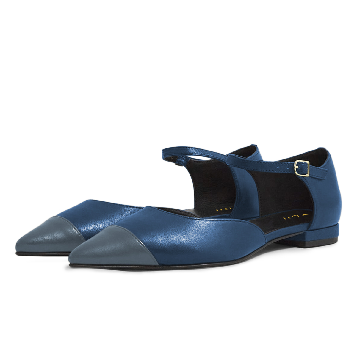Shiny Blue Vegan Leather Gray Pointed Toe Buckle Strap Flat Pumps