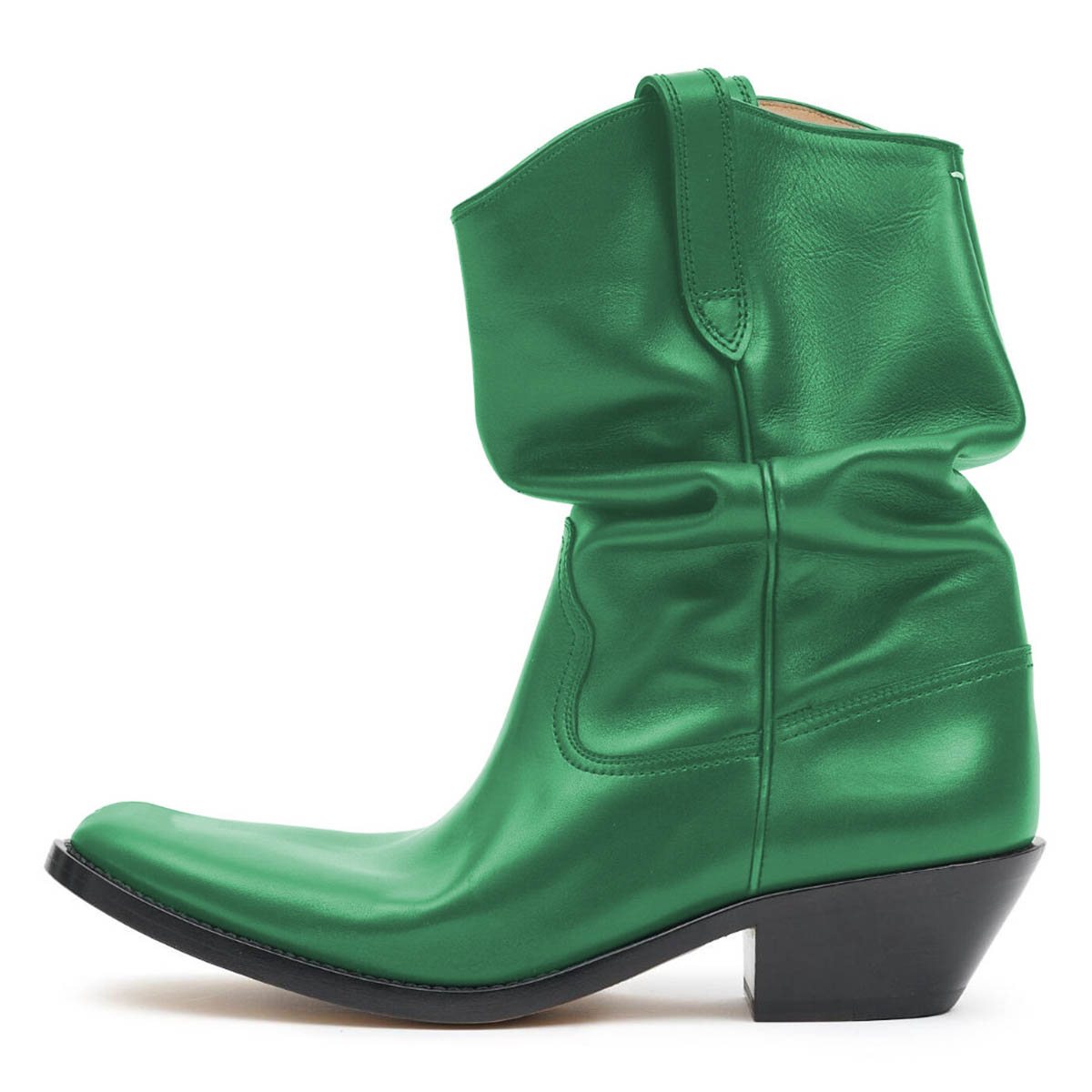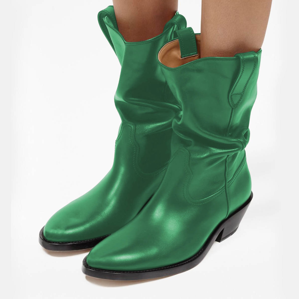 • Special Designs: Green shiny boots featuring classic side loops and a low block heel