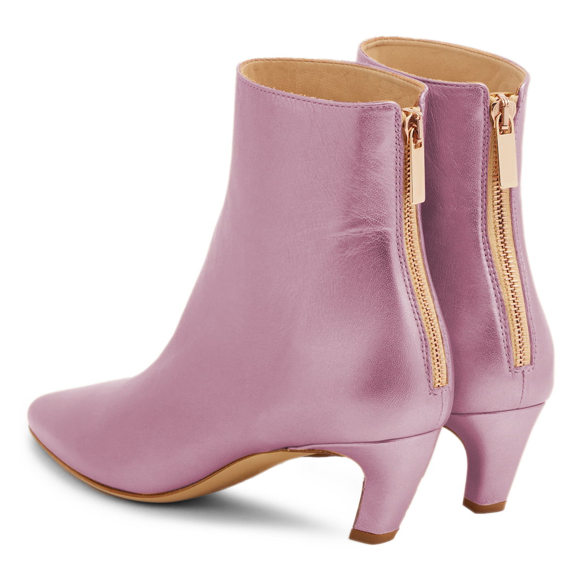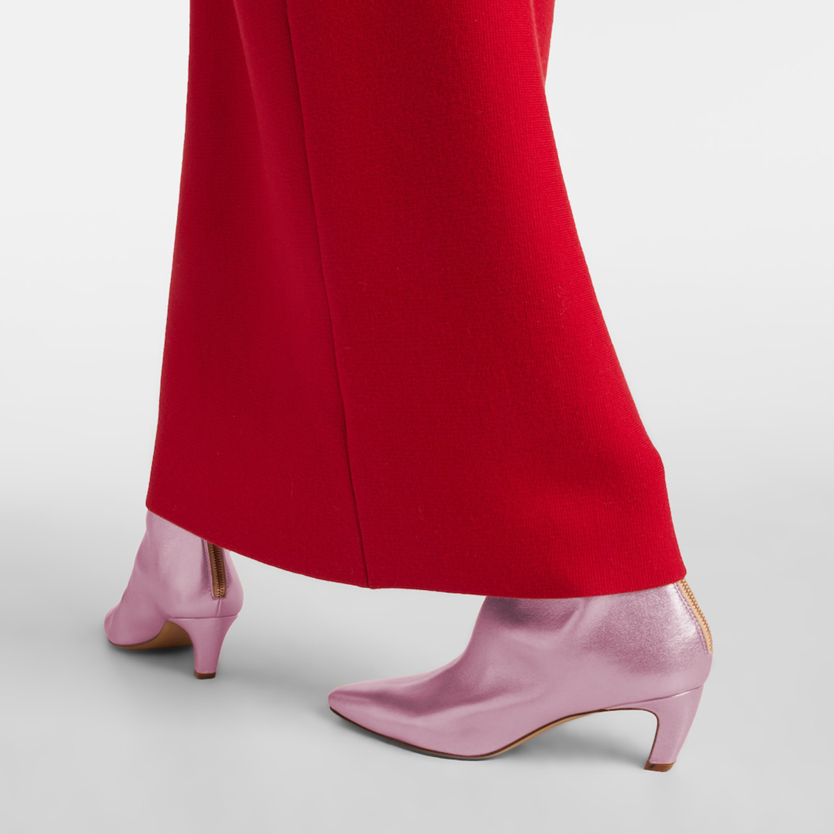• Special Designs: Pink booties with classic kitten heel and back-zip closure.