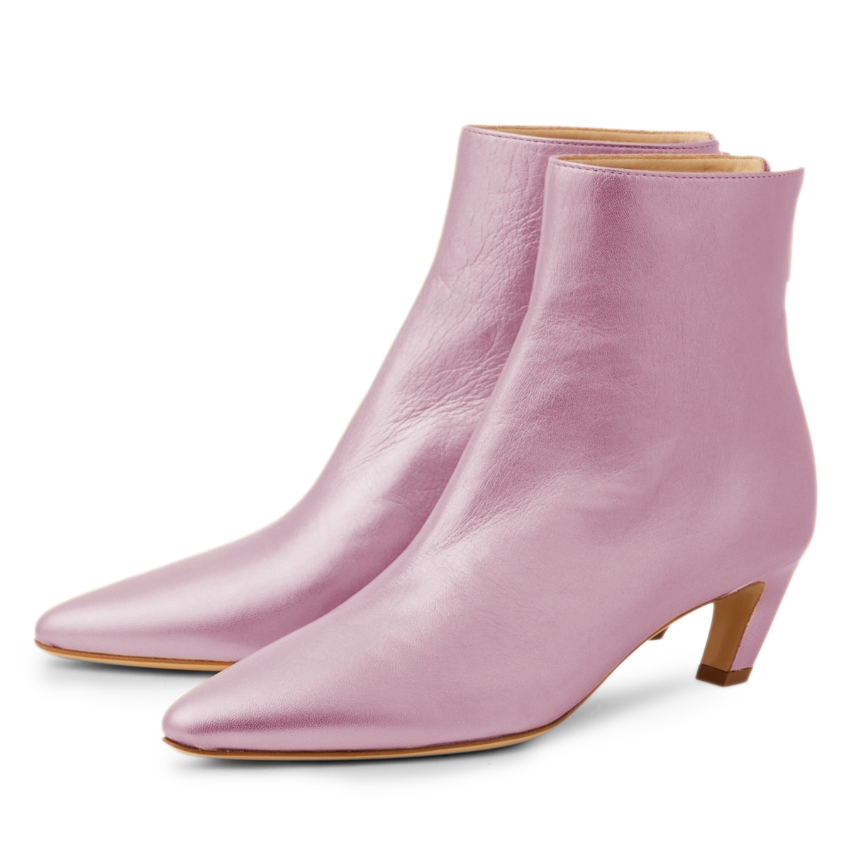 Shiny Pink Vegan Leather Pointed Toe Back-Zip Kitten Heel Ankle Boots