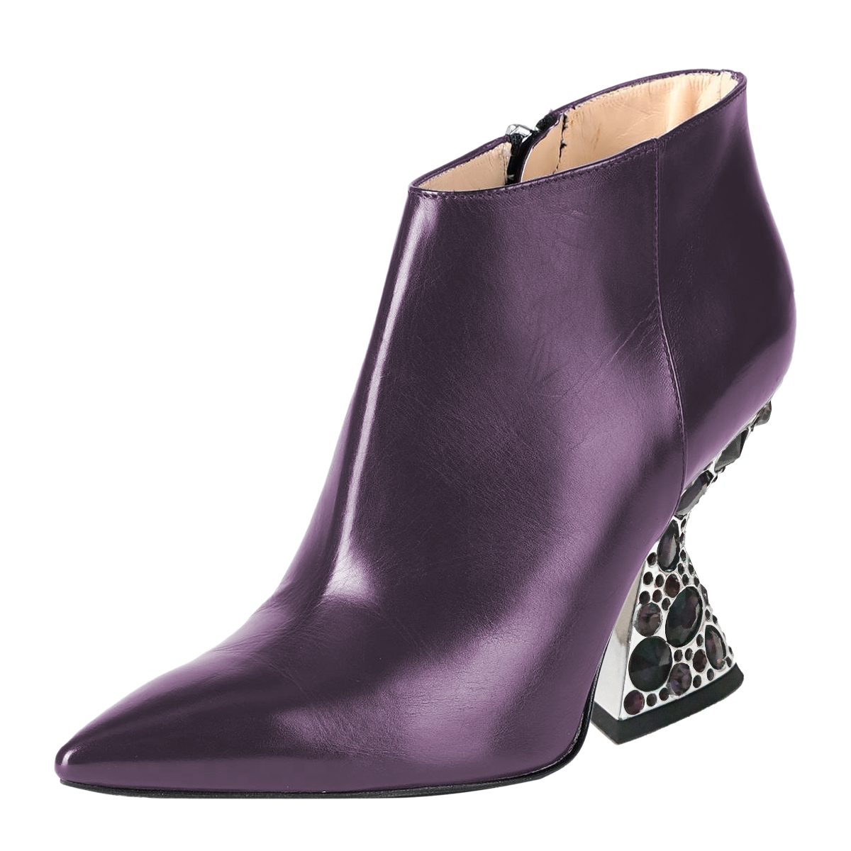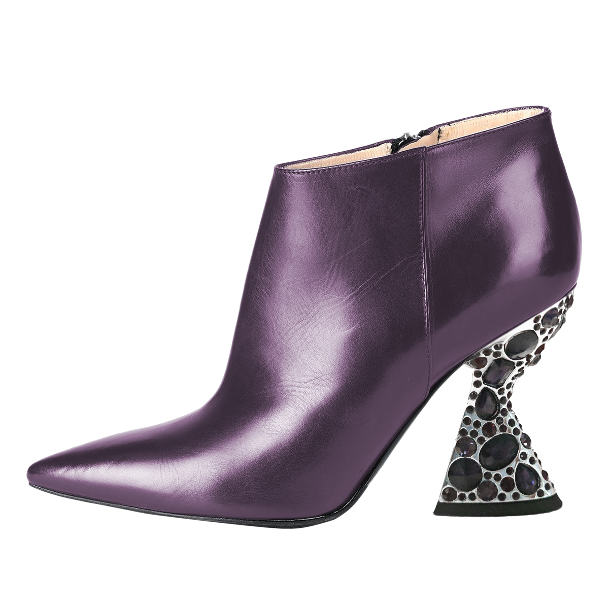 • Special Designs: Purple ankle boots with a sparkling decorative heel and side-zip closure.