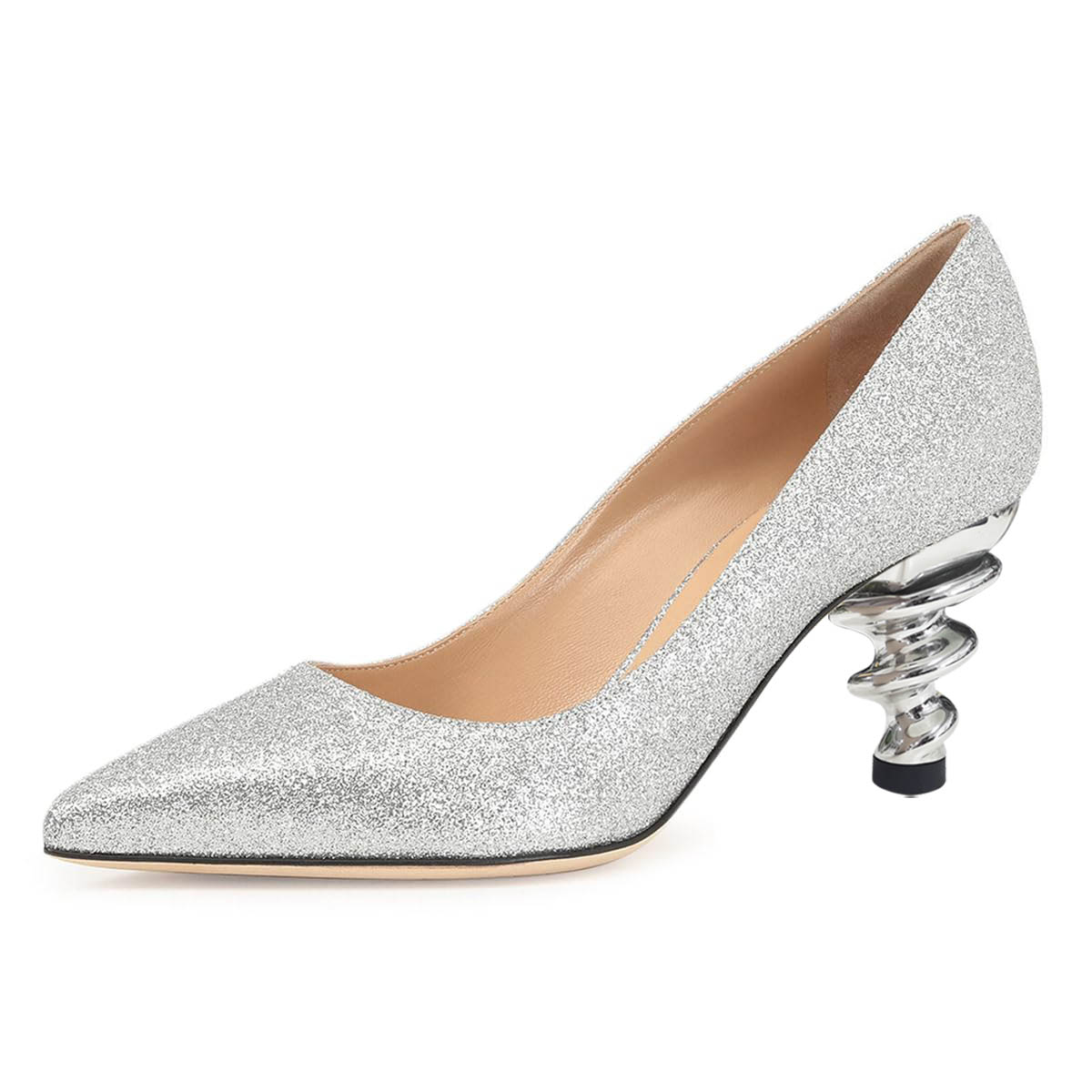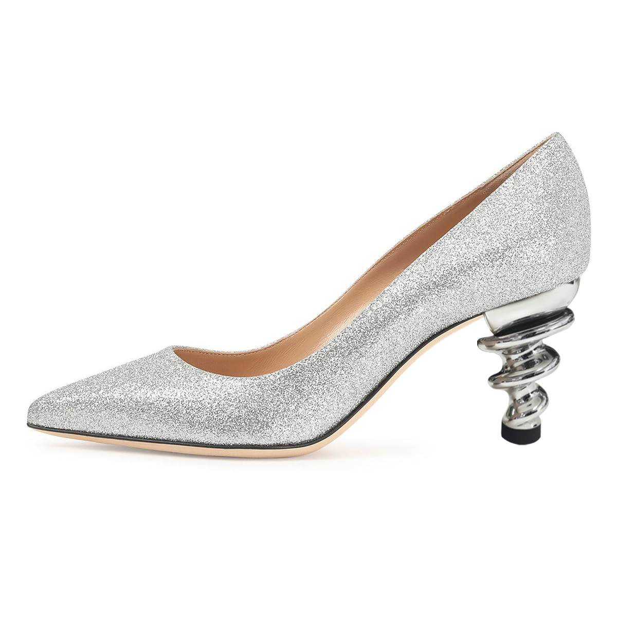 Shiny Silver Pointed Toe Slip-On Spiral Heel Glitter Pumps Shoes