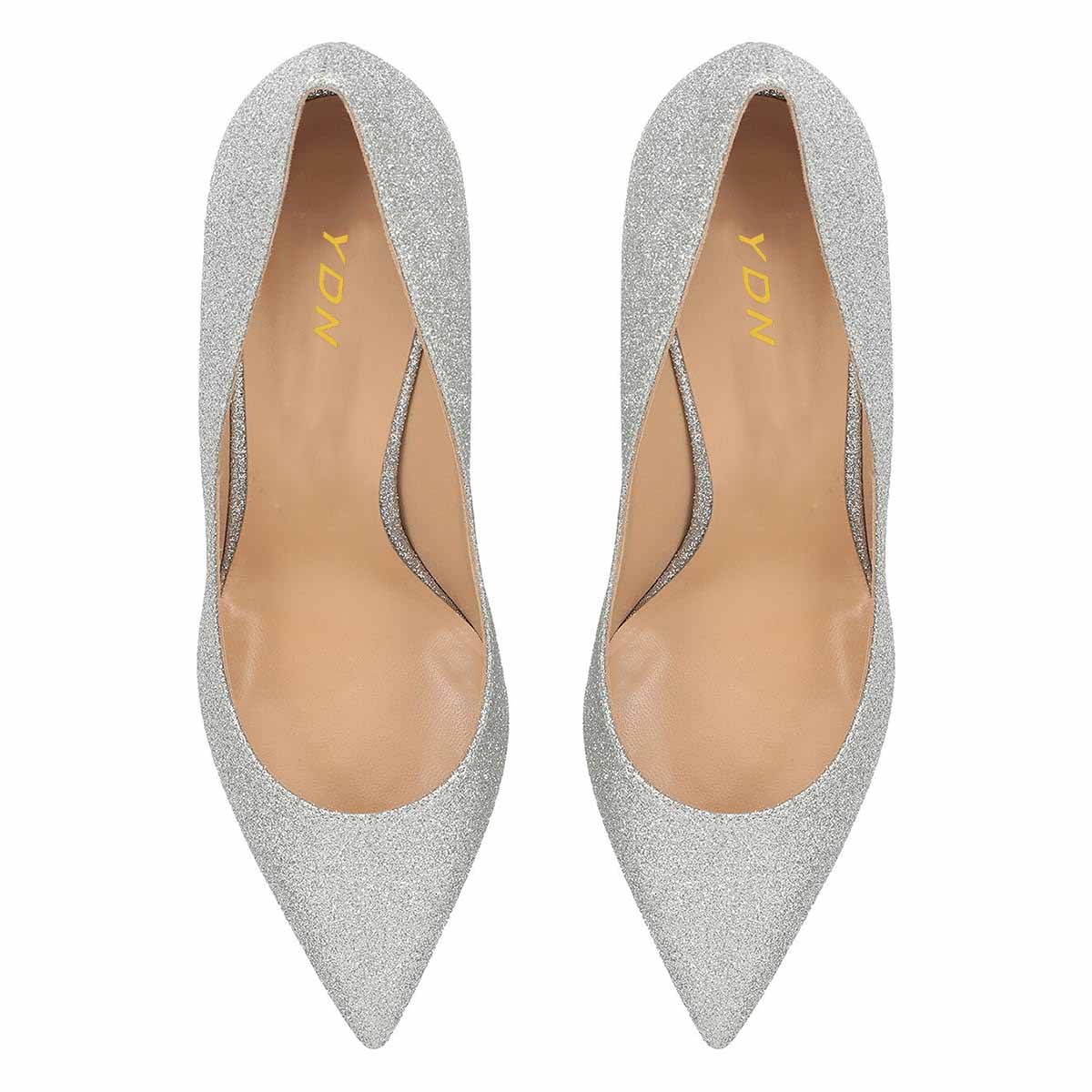 Special Designs: The pointed-toe pump shoes feature a special spiral heel and glitter embellishment.