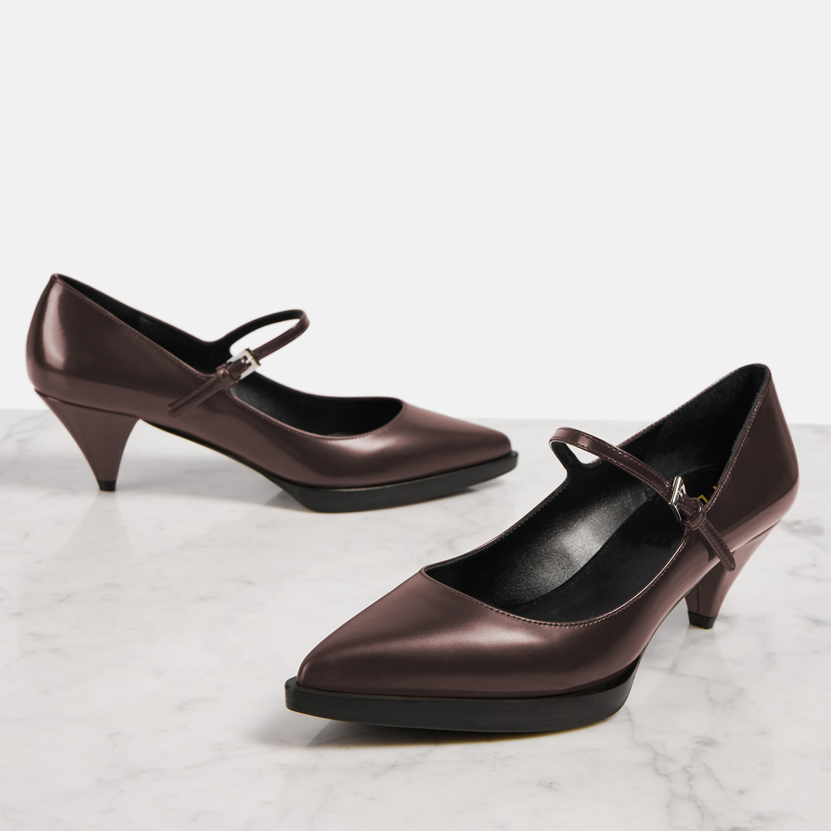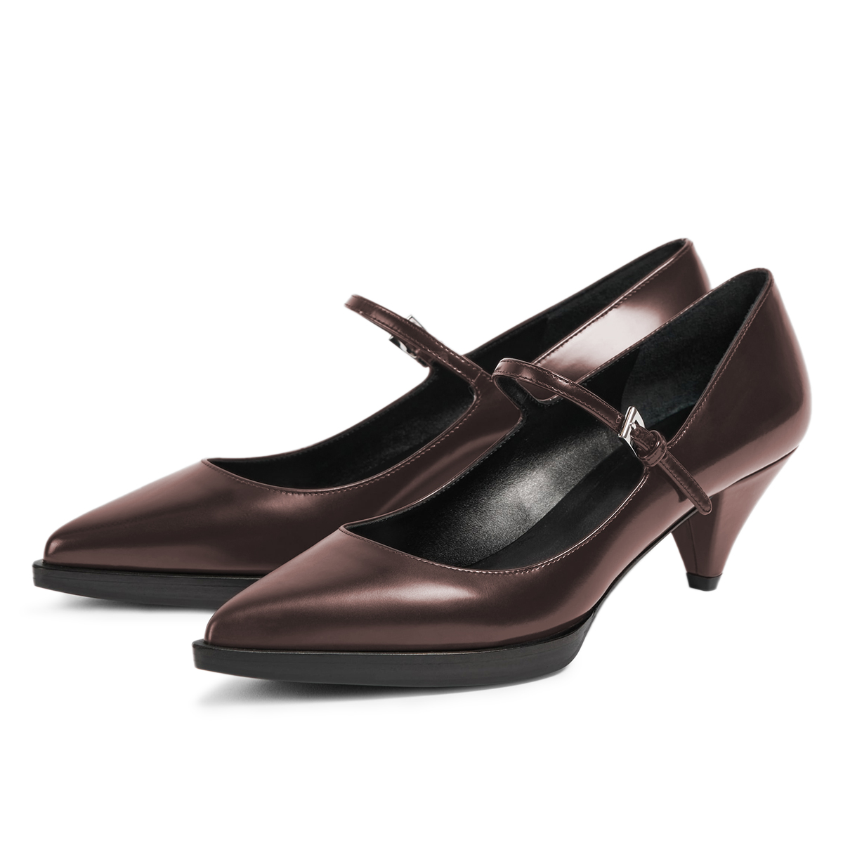 • Special Designs: Brown pumps with vegan leather sophistication and a buckle fastening strap design