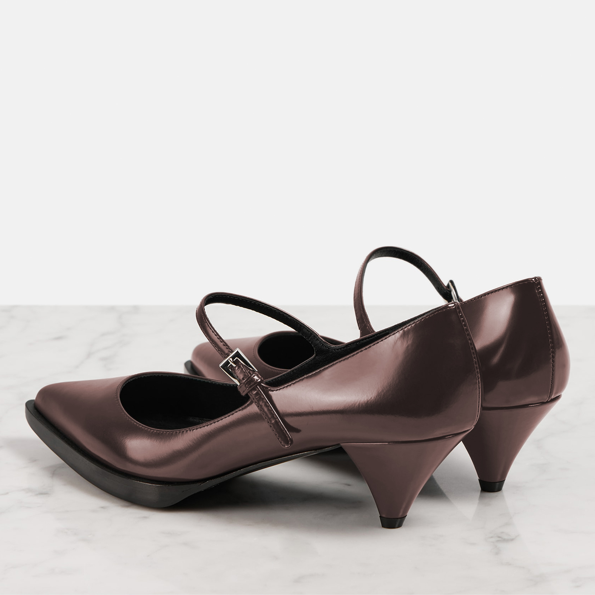 Shiny Vegan Leather Buckle Fastening Strap Pencil Heel Pumps in Brown