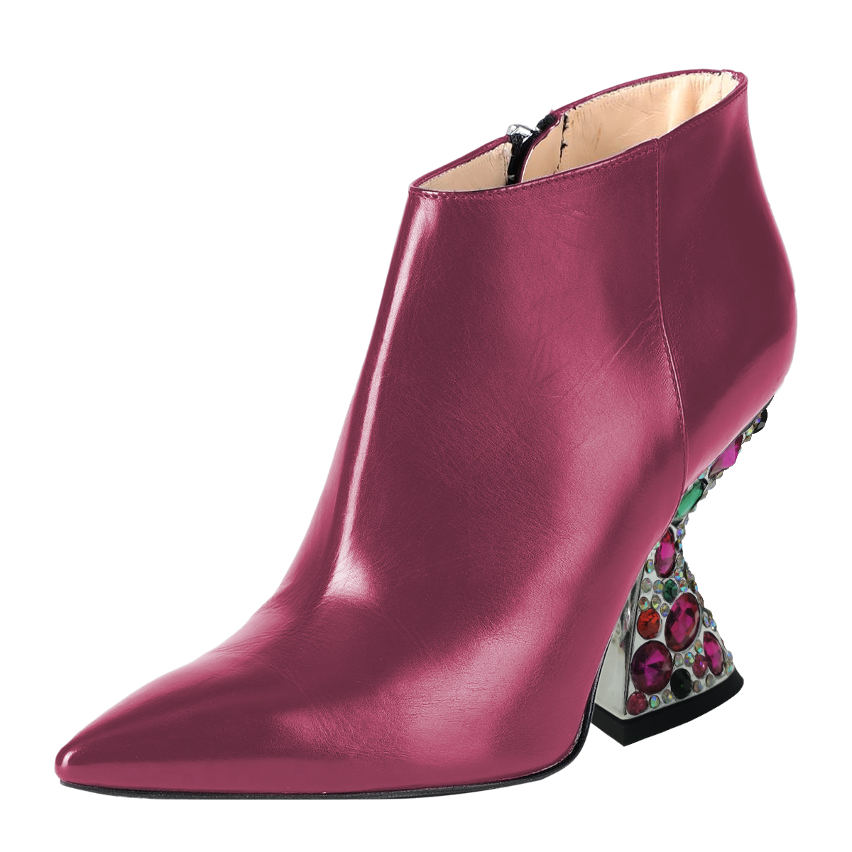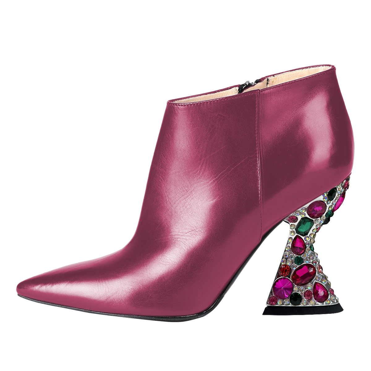 Special Designs: Magenta ankle boots with a sparkling decorative heel and side-zip closure.