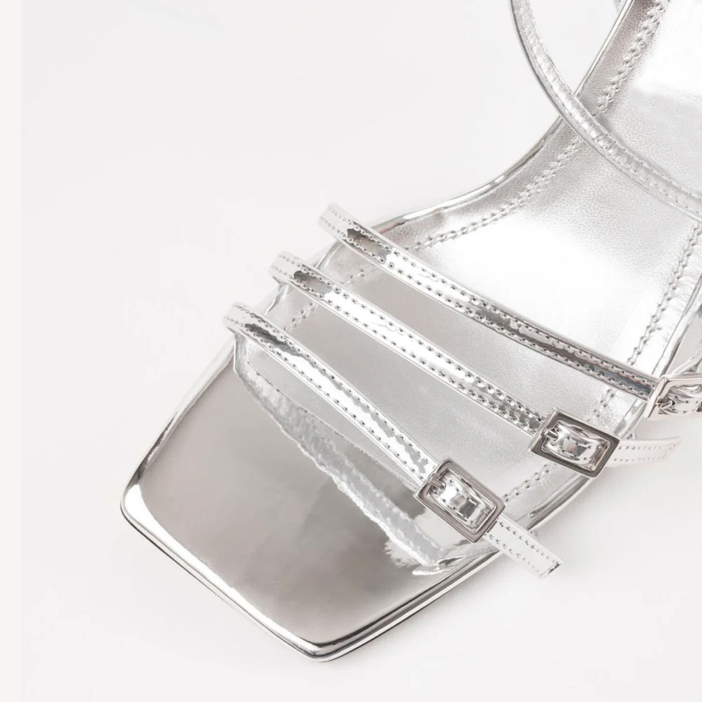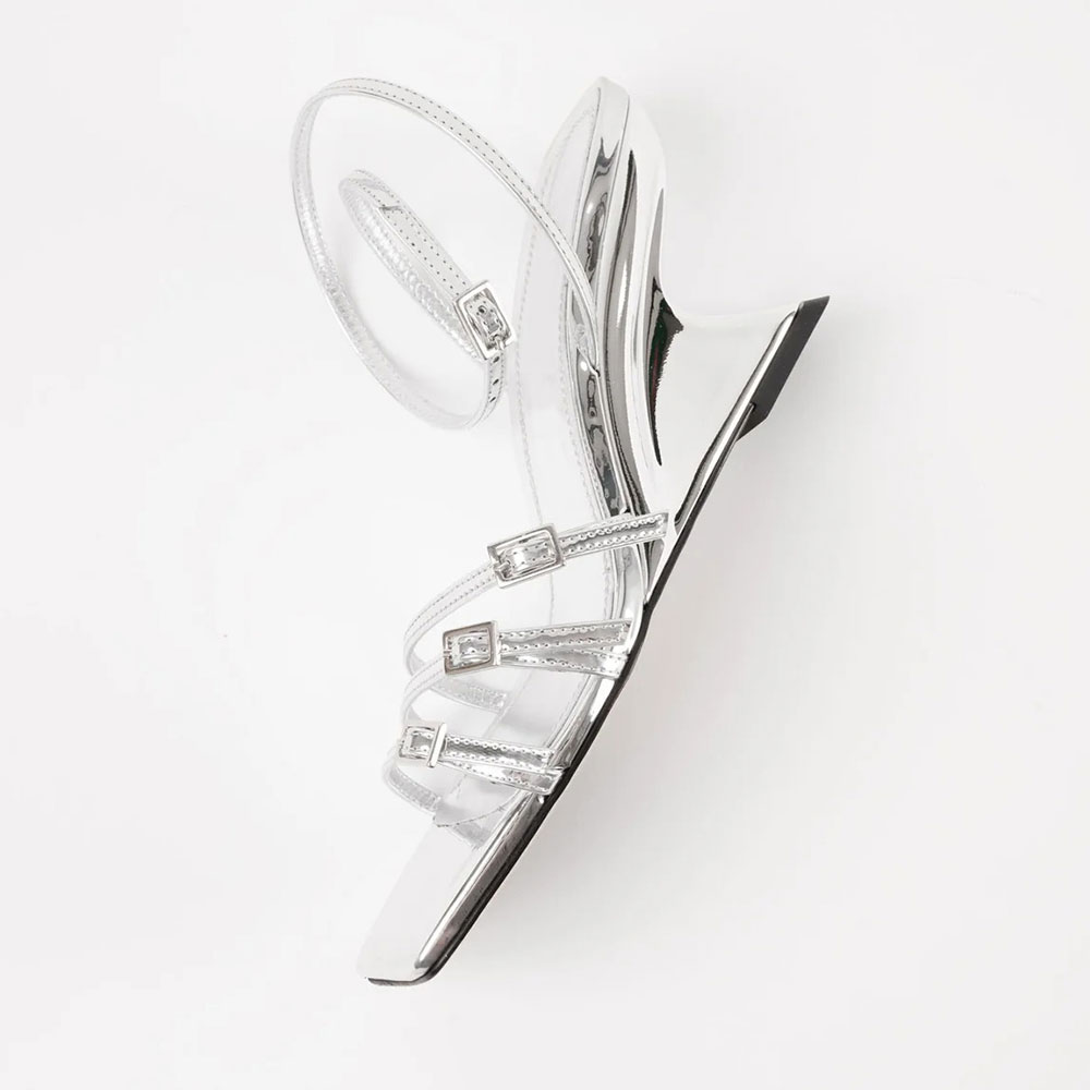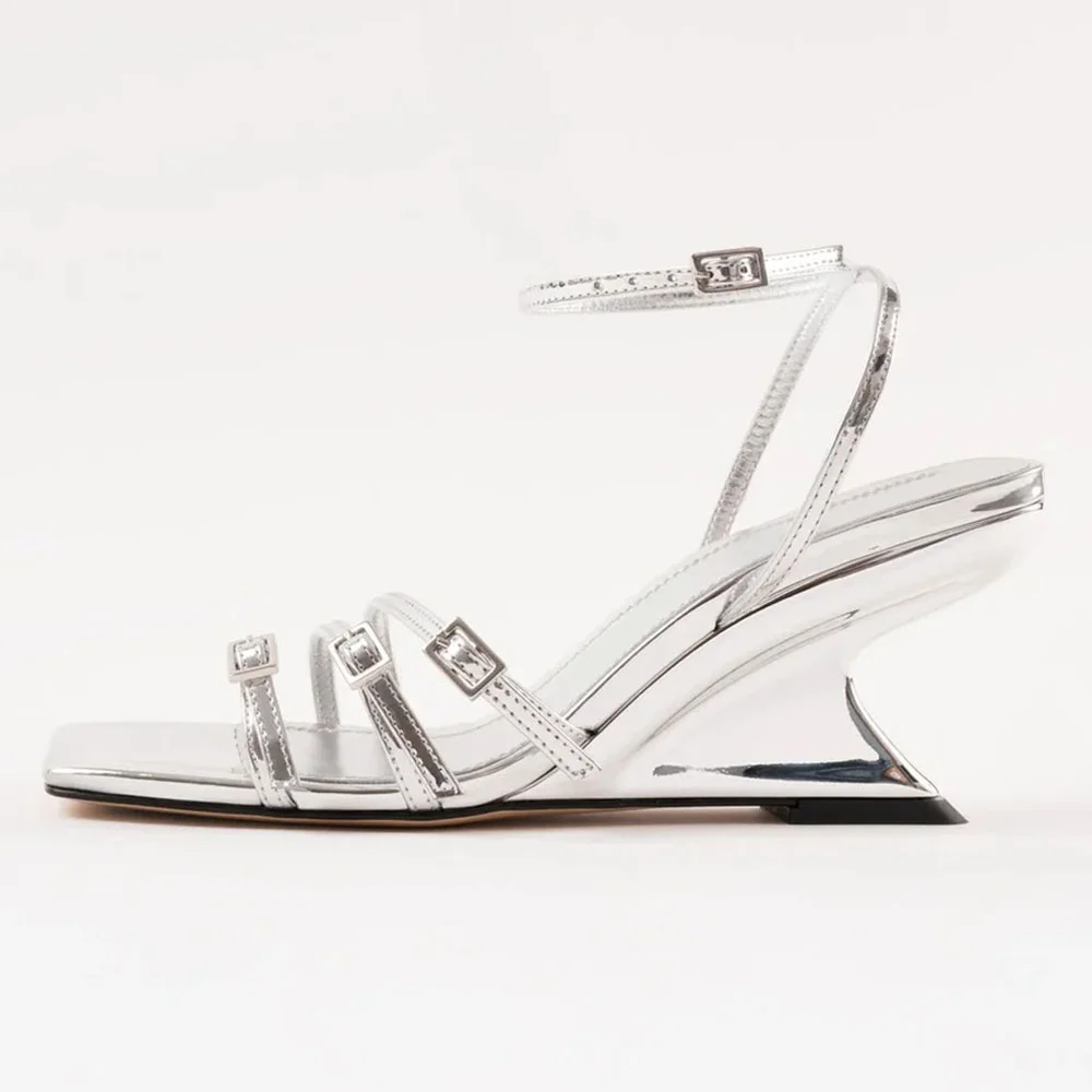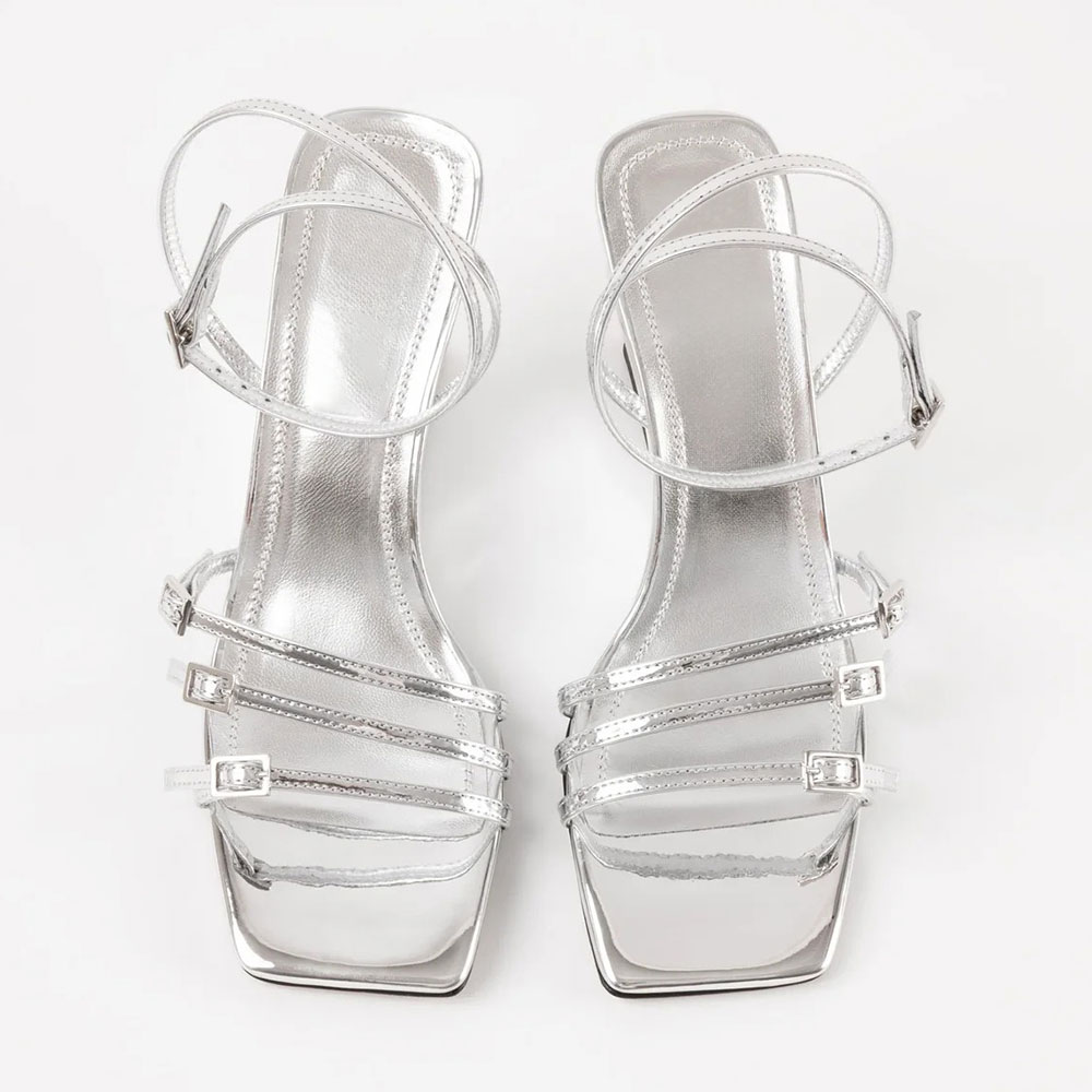 • Special Designs: These silver sandals feature a square toe and wedge heel, designed with multiple thin straps adorned with silver-tone buckles for an adjustable fit.