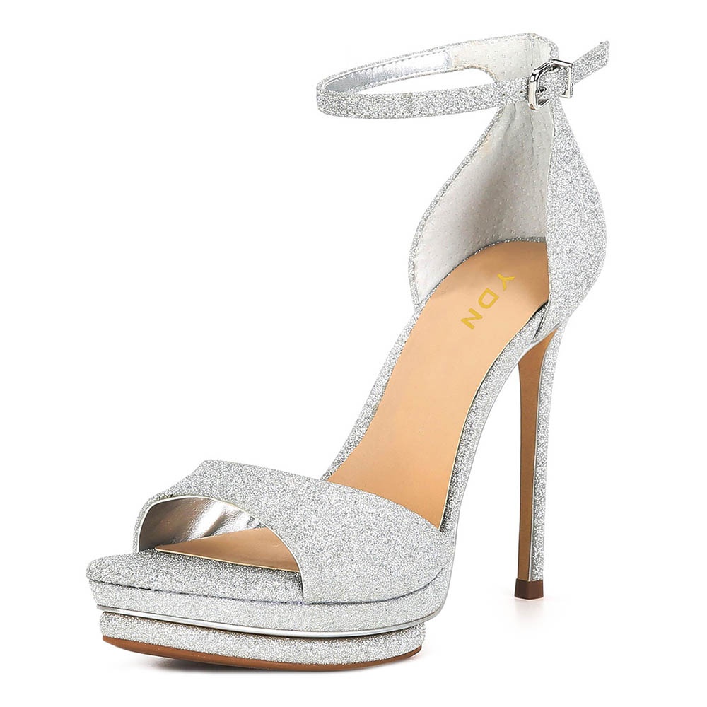 Silver Glitter Stiletto Heel Ankle Strap Platform Sandals for Women
