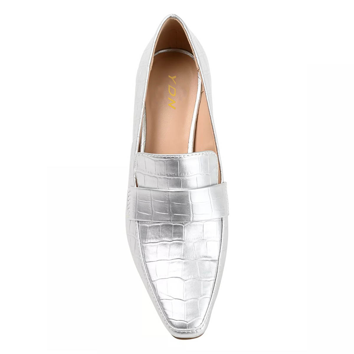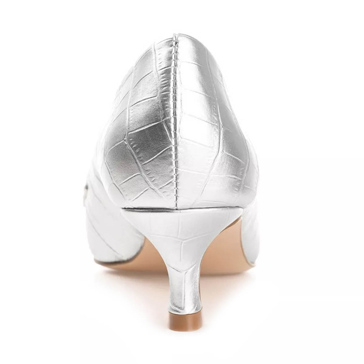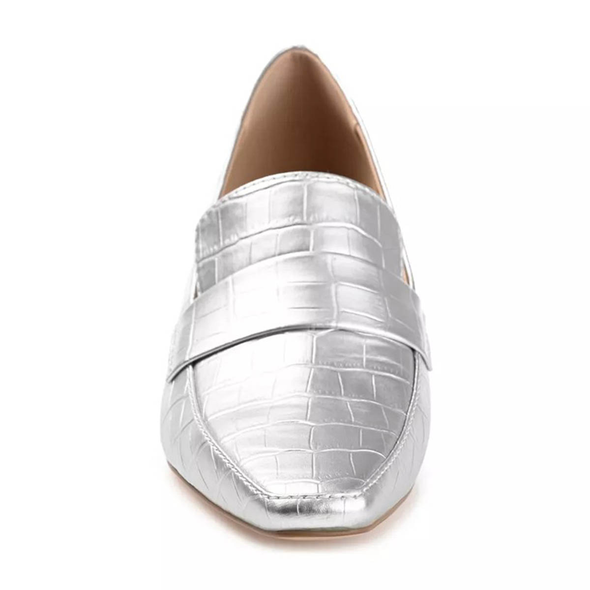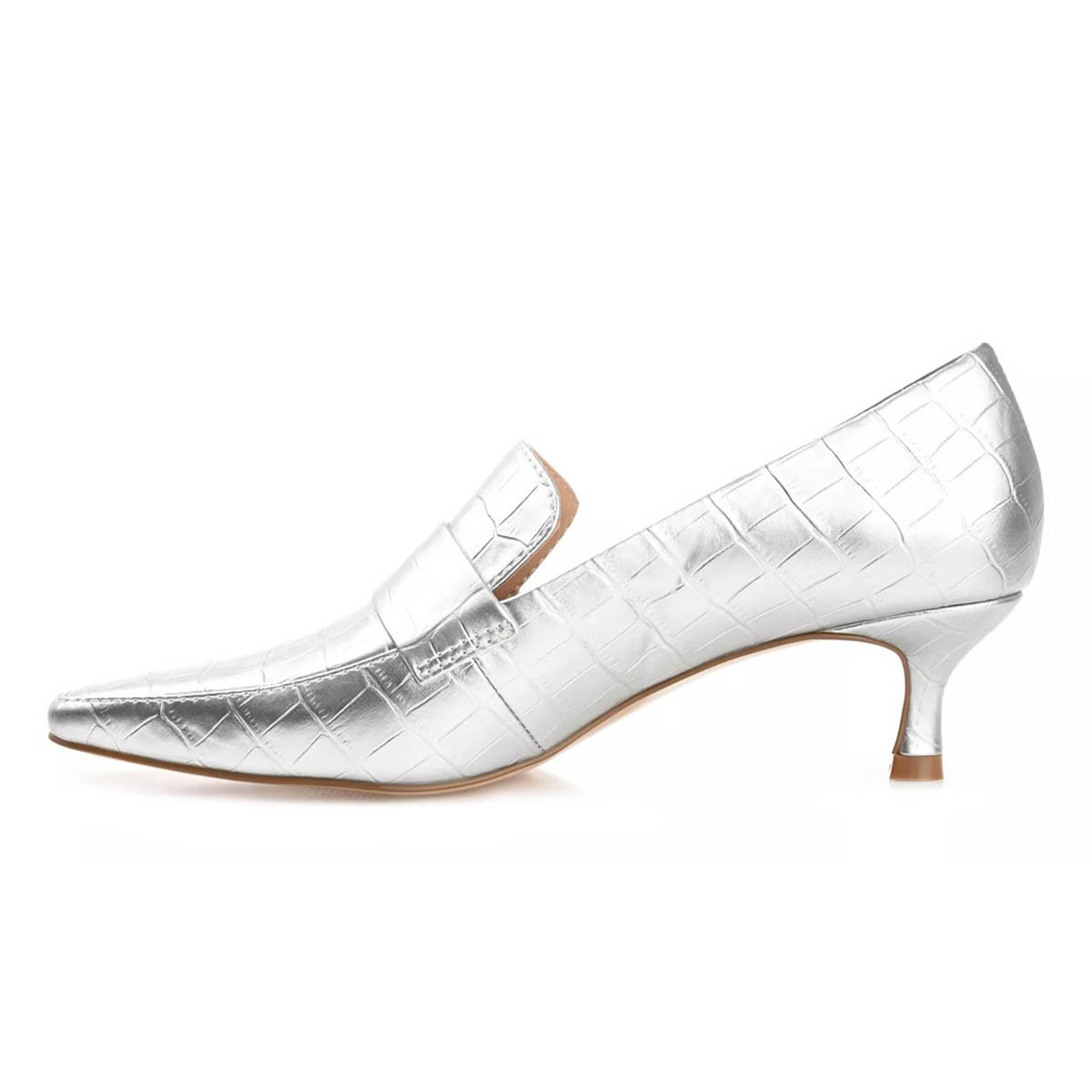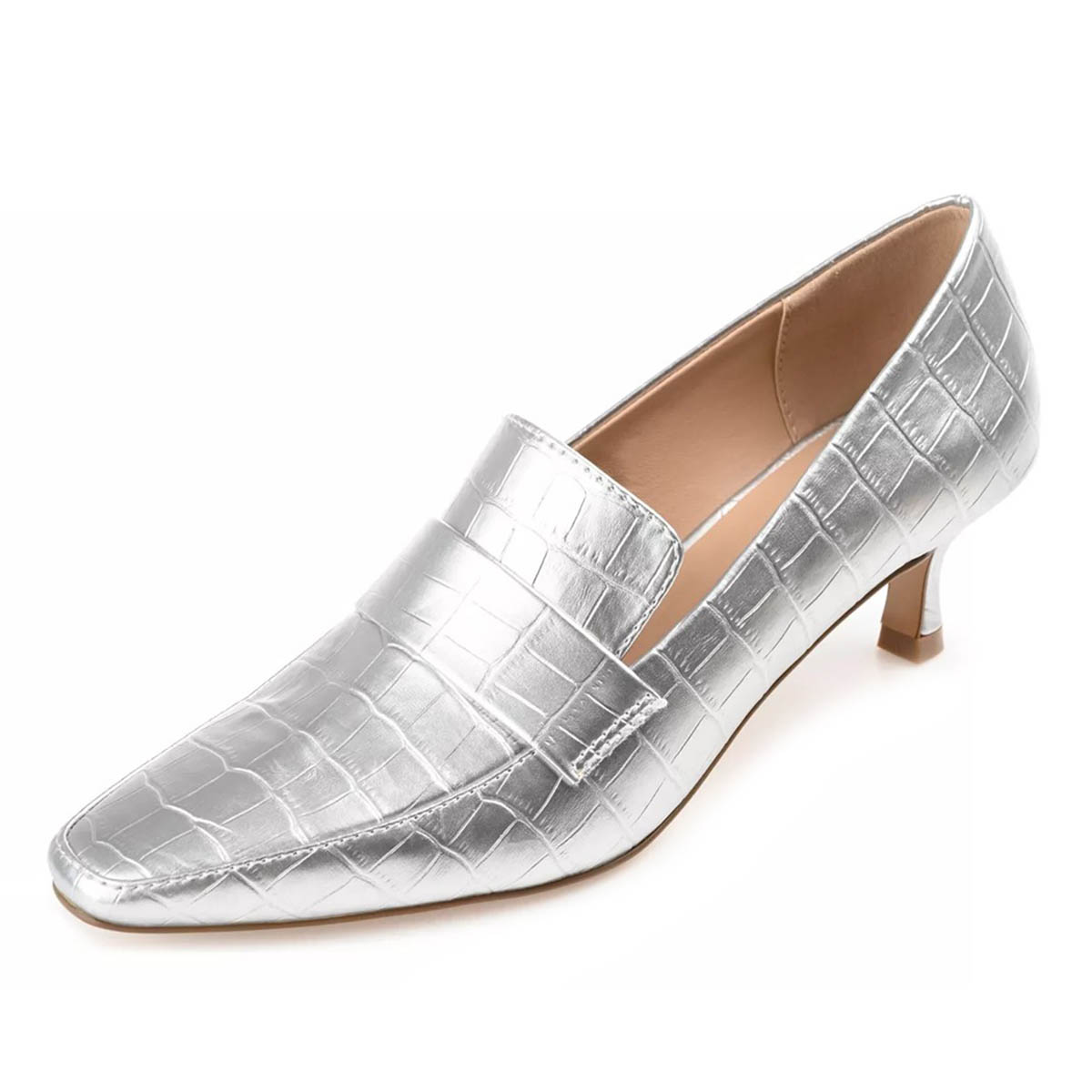 Silver Metallic Finish Croc Embossed Square Toe Loafer Heels
