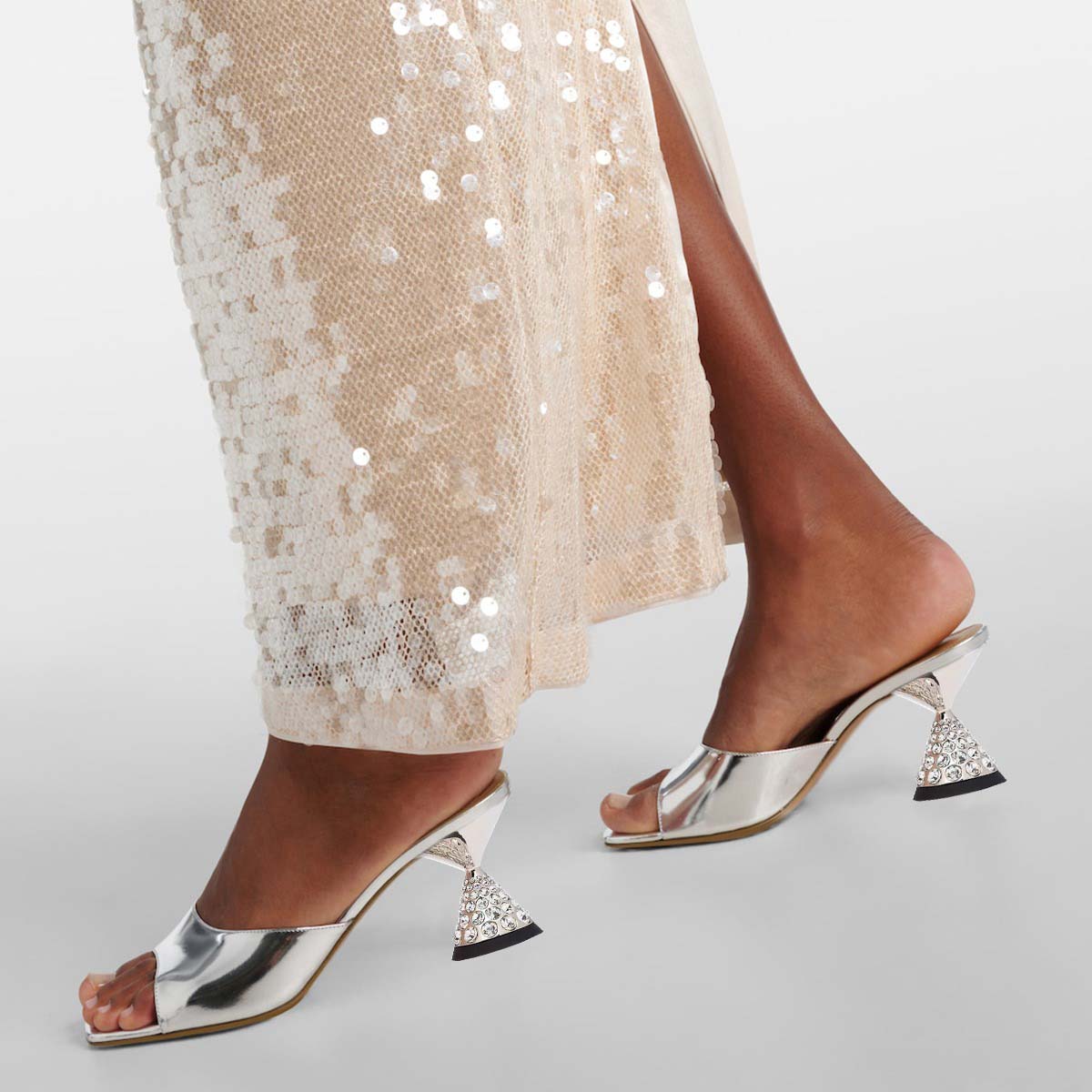 • Special Designs: The silver square-toe heeled mules feature sculptural heels adorned with sparkling rhinestones and a slip-on design for convenience.