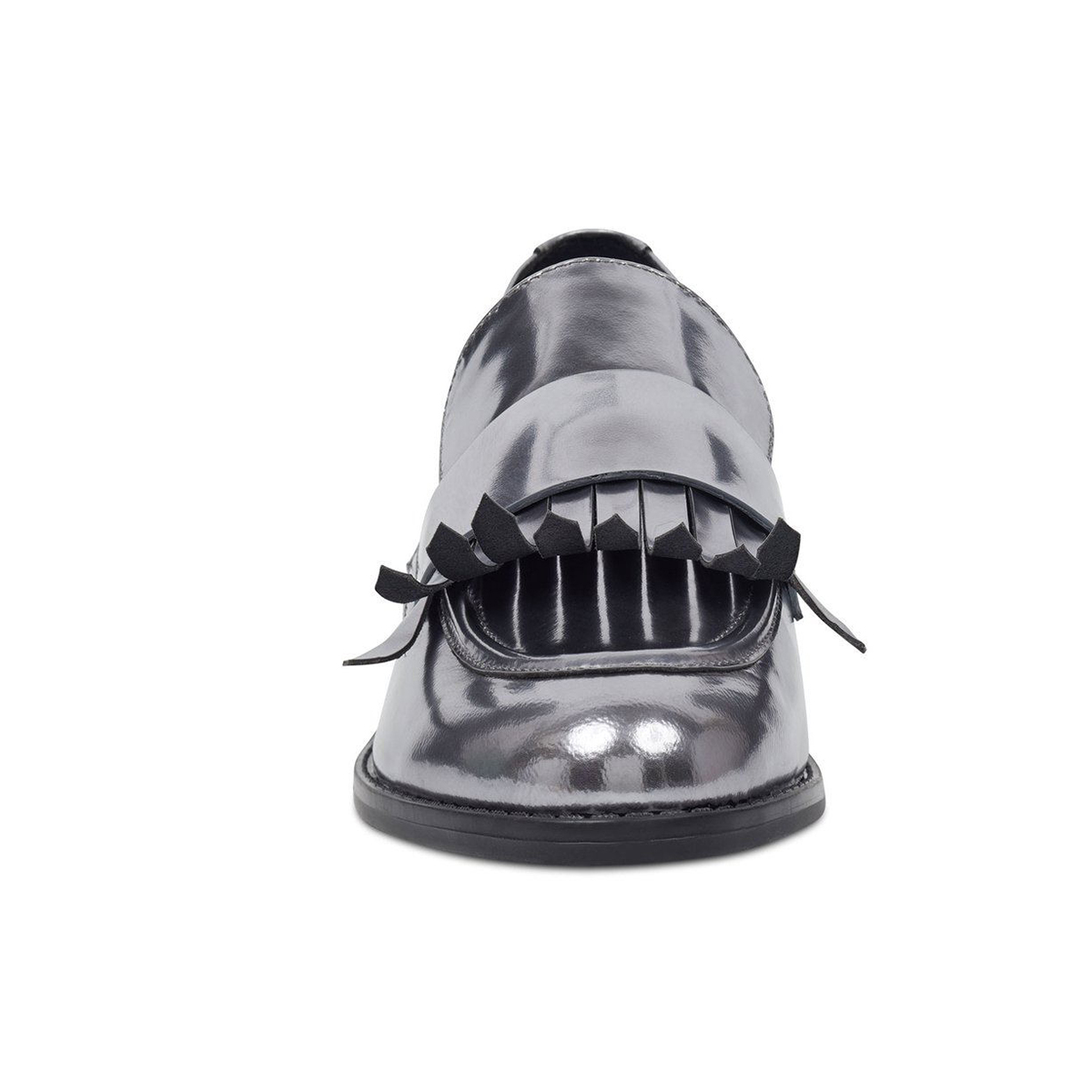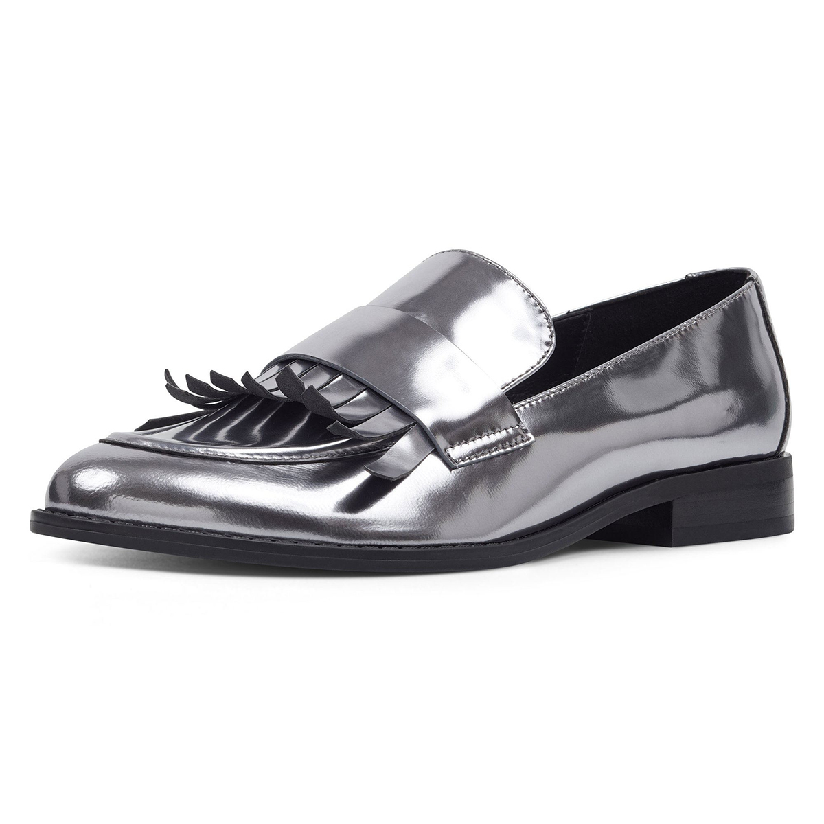 Special Designs: Silver metallic touch loafers featuring a fringe inlay and slip-on convinience.