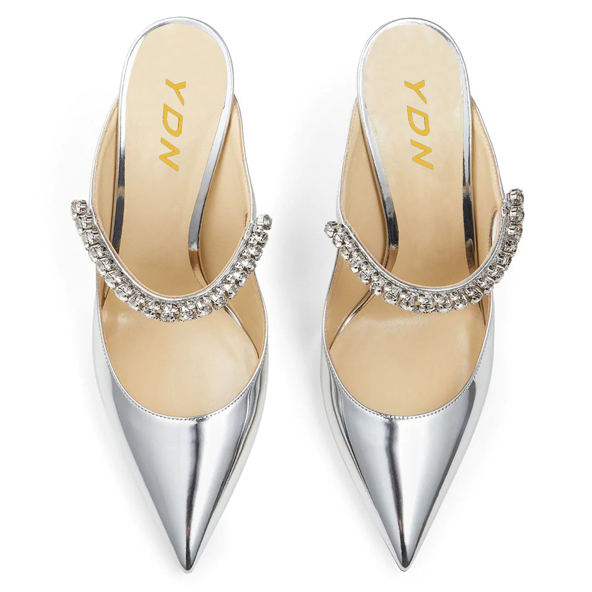 • Special Designs: Silver patent leather mules feature a rhinestoen embellished strap inlay and a metallic finish decorative heel.