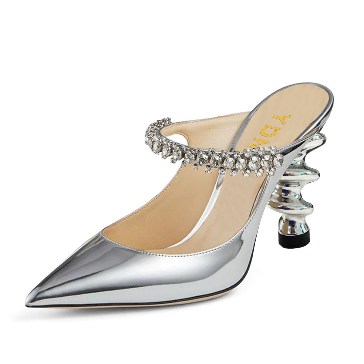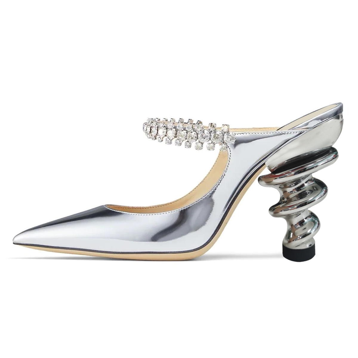 Silver Patent Leather Sculptural Heel Rhinestone Strap Mules Shoes