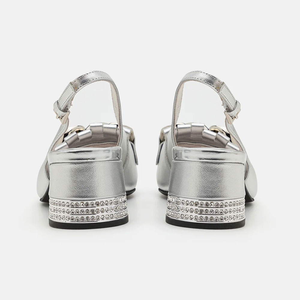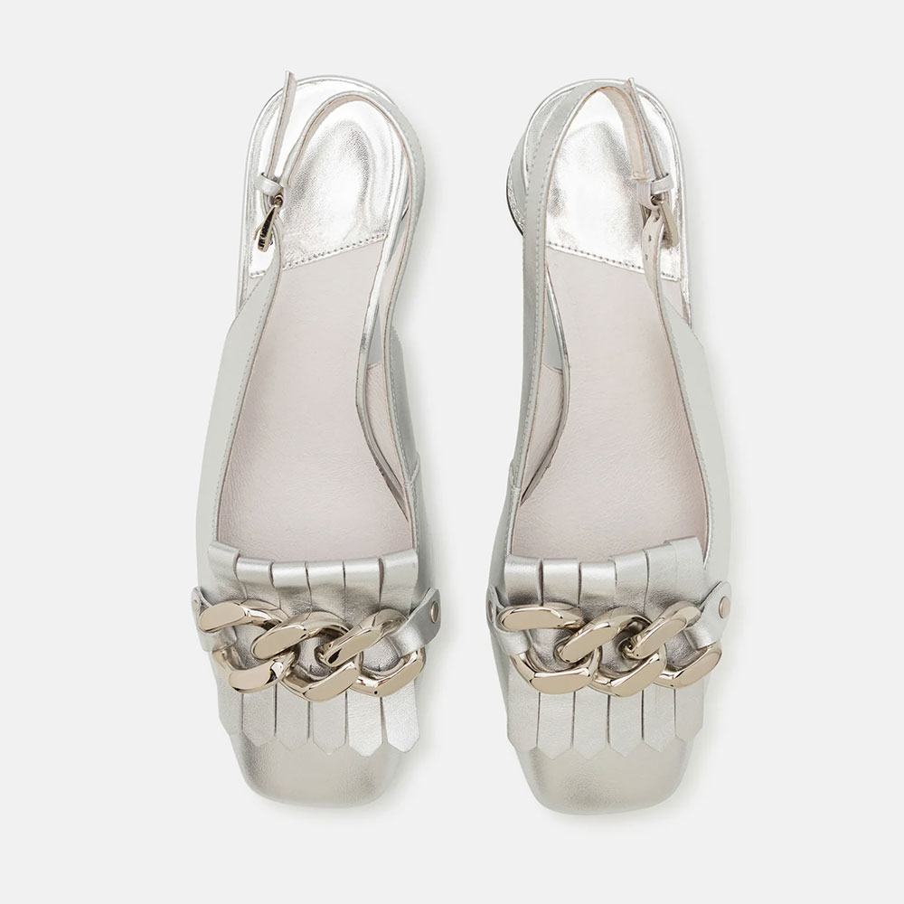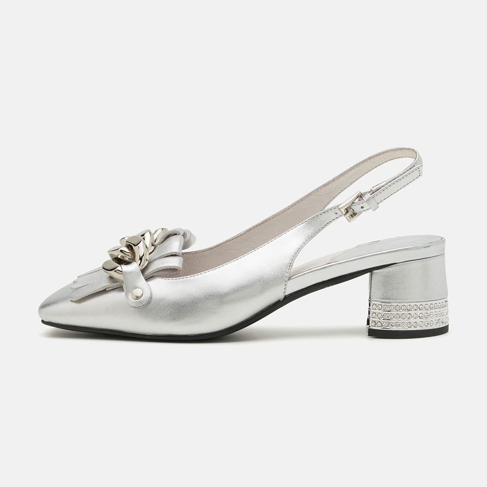 Silver Square Toe Chain Fringe Slingback Pumps with Rhinestone
