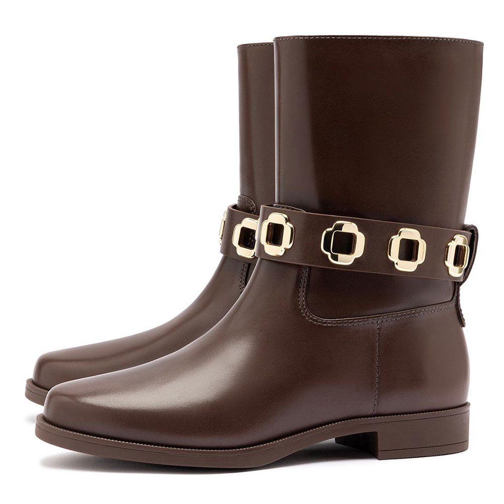 Simple Brown Round Toe Flat Ankle Boots with Hardware Strap