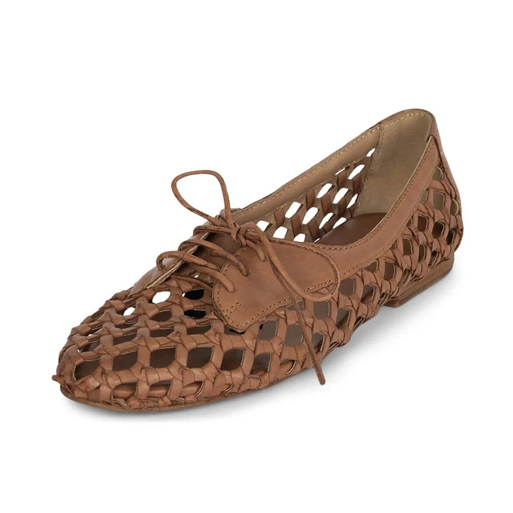 Simple Brown Tie-Up Round Toe Woven Details Flats with Cut-Outs