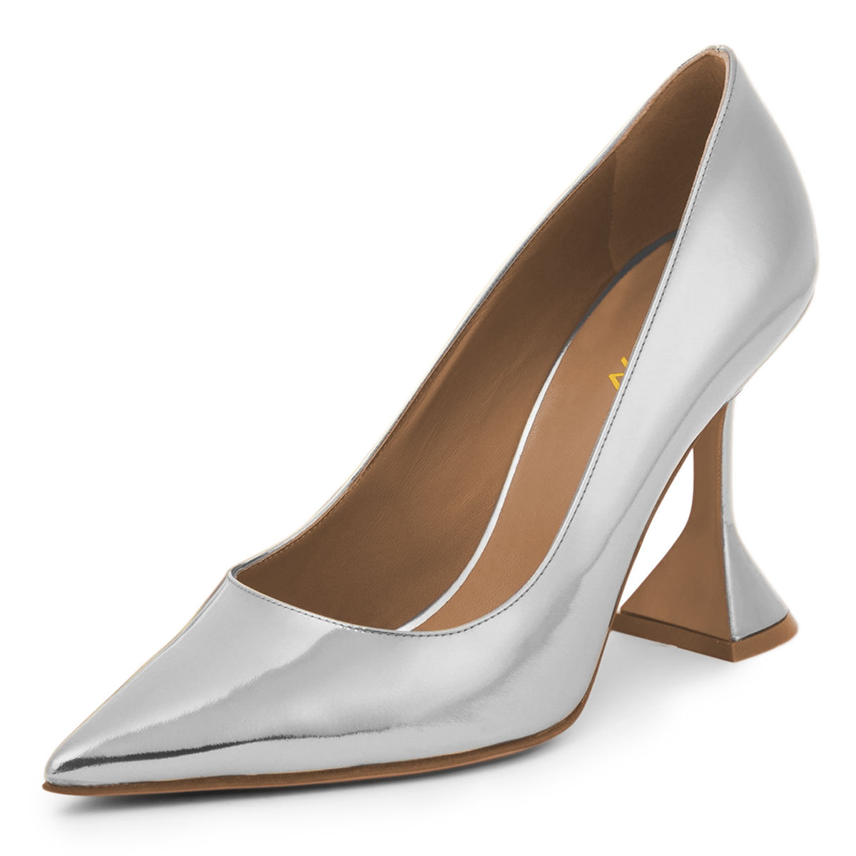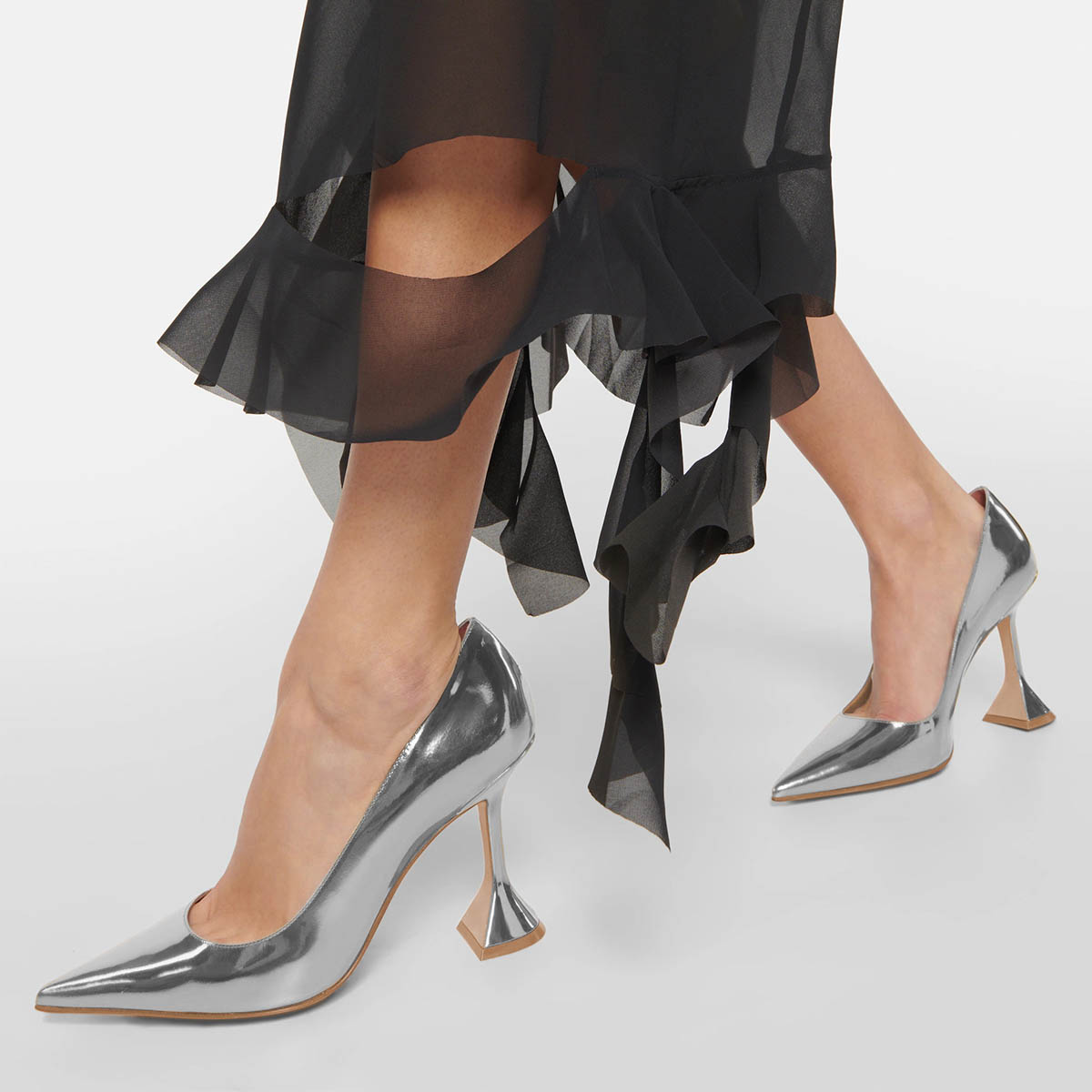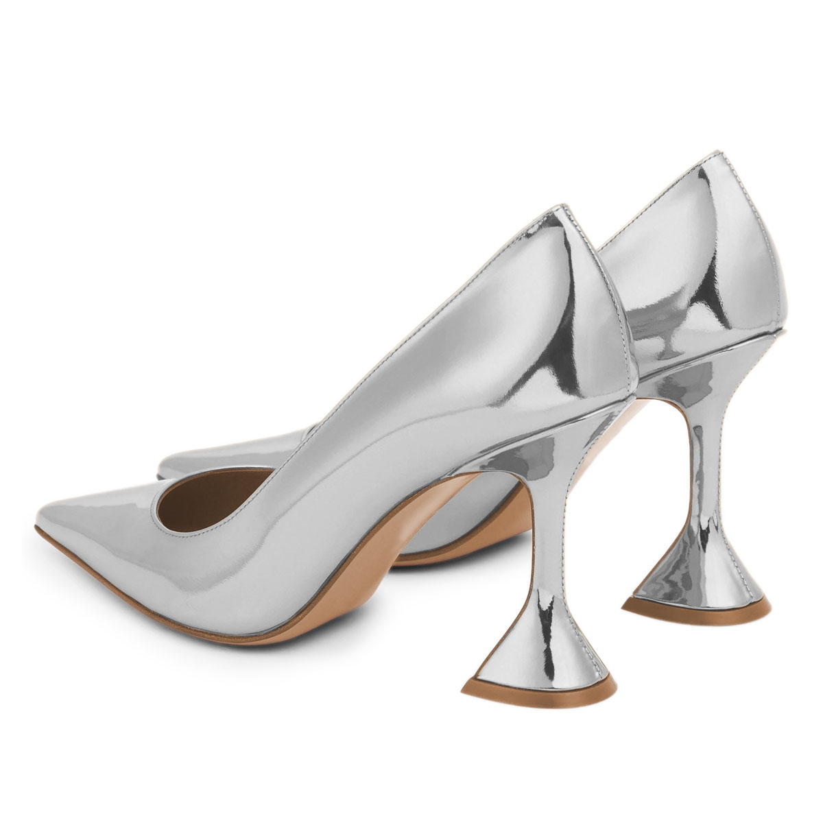 Special Designs: The silver pumps feature flared heels and a pointed-toe design.