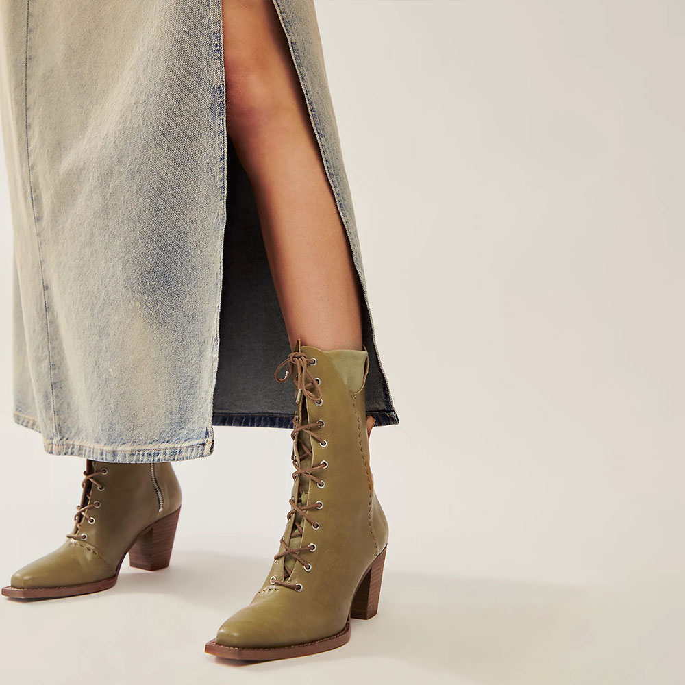 Simple Olive Square Toe Lace-Up Stacked Heel Booties for Women