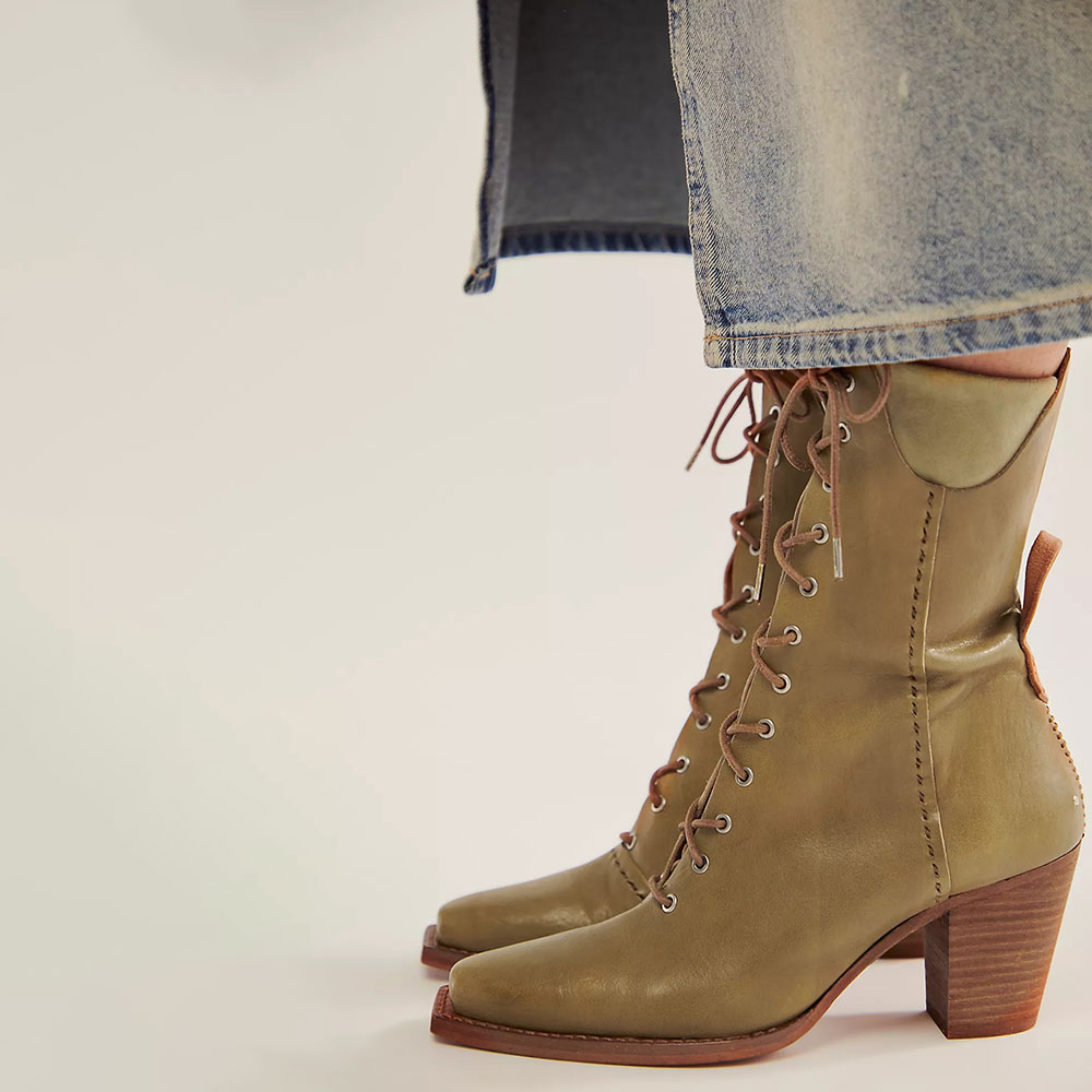 • Special Designs: The square-toe booties feature stacked heels and a lace-up design.
