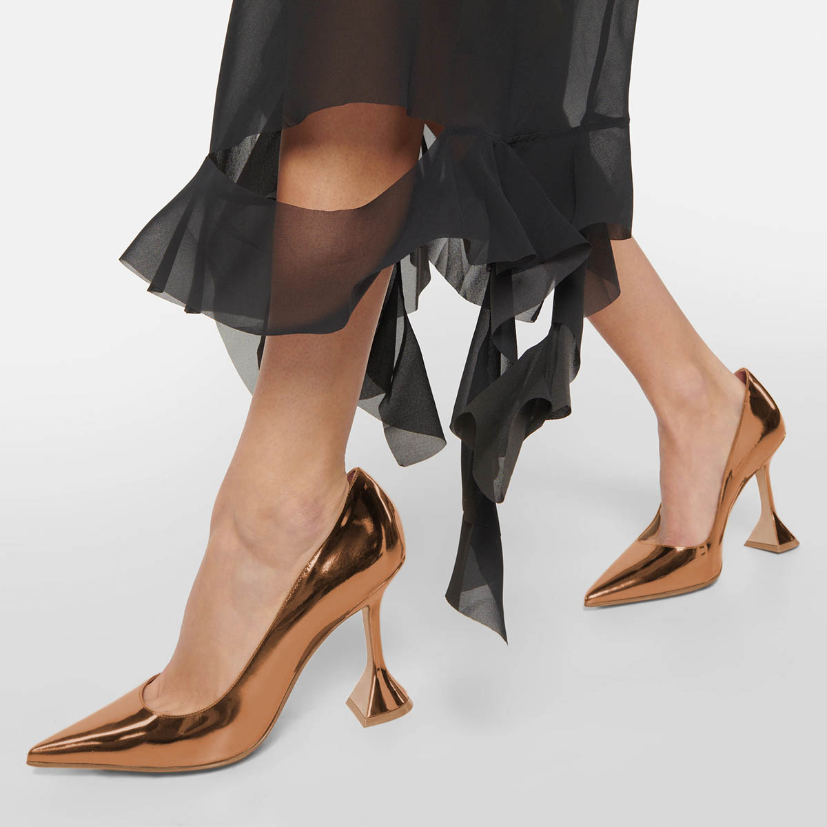 Simple Tan Metallic Finish Flared Heel Pointed Toe Pumps Shoes