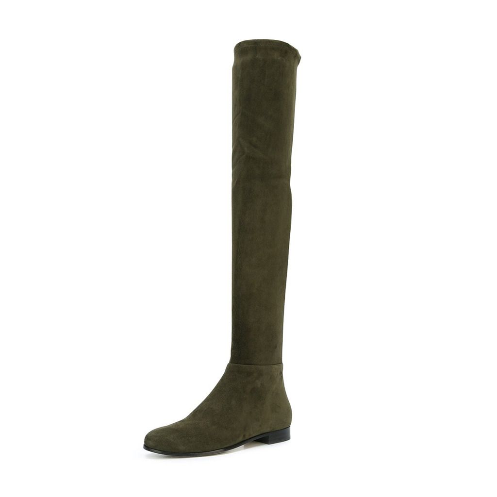 Simple Vegan Suede Chunky Heel Round Toe Over The Knee Boots in Olive