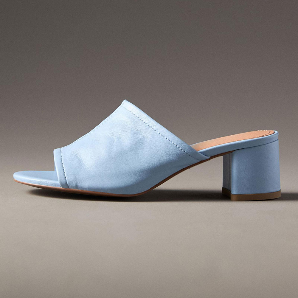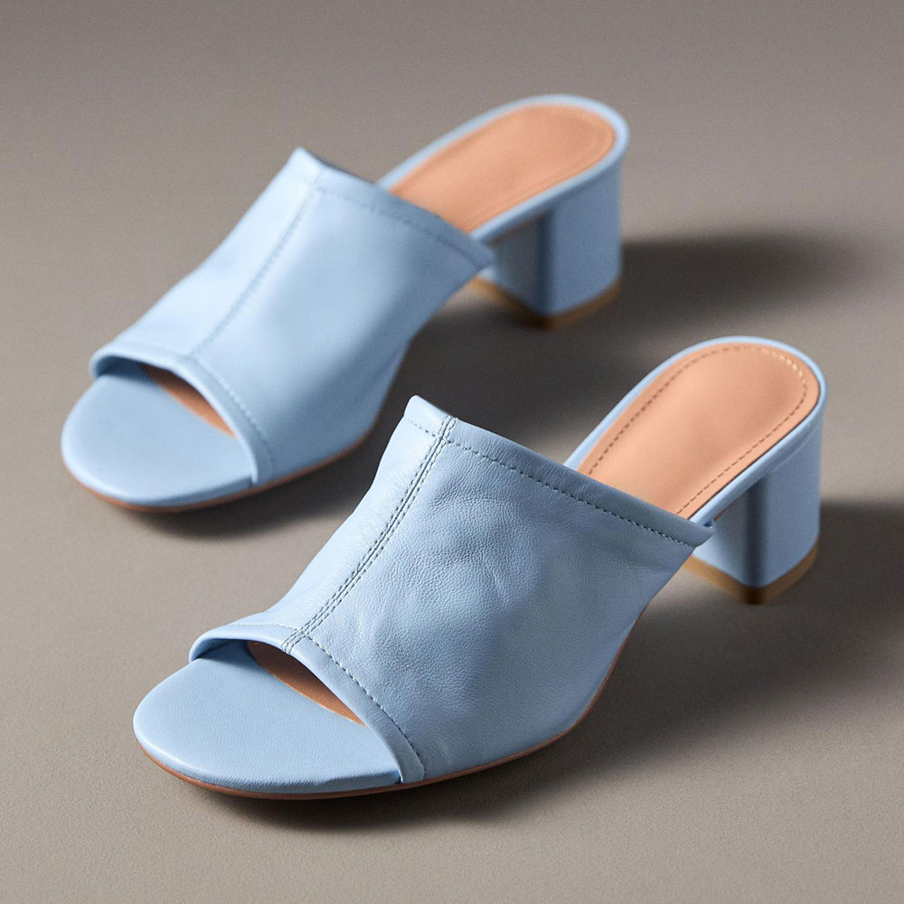 Special Designs: The open-toe mule sandals feature a comfortable chunky heel.