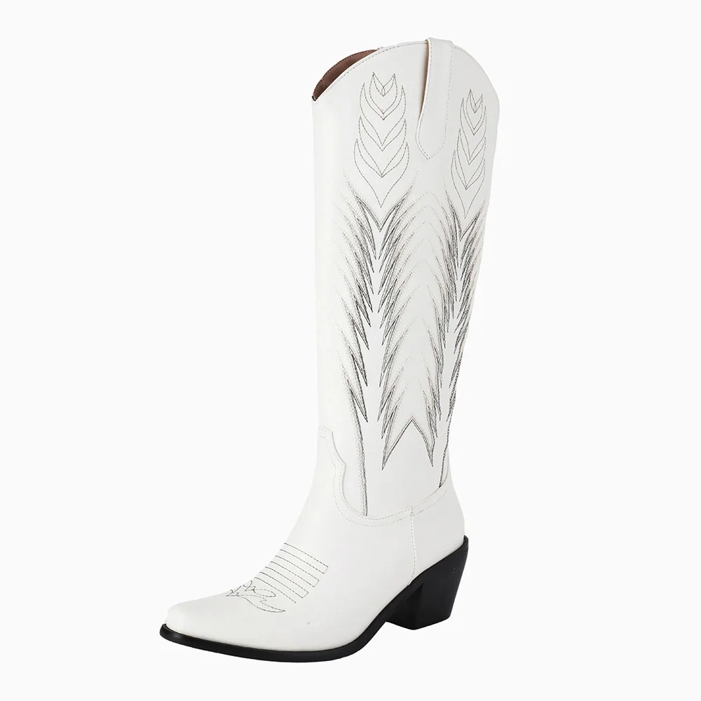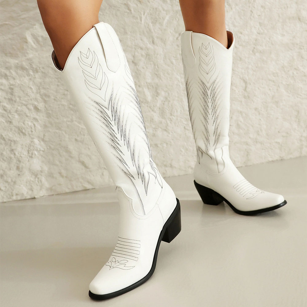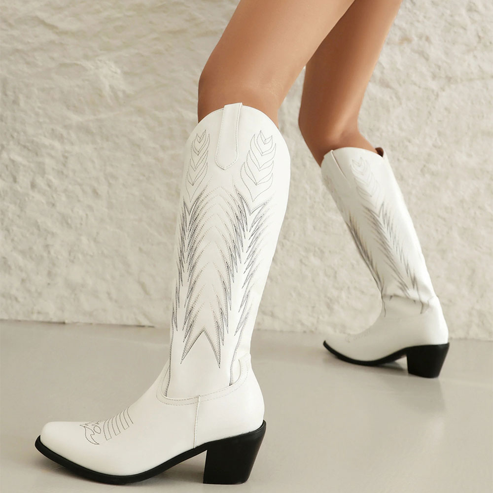 Snip Toe Chunky Heel Embroidered Western Boots for Women in White
