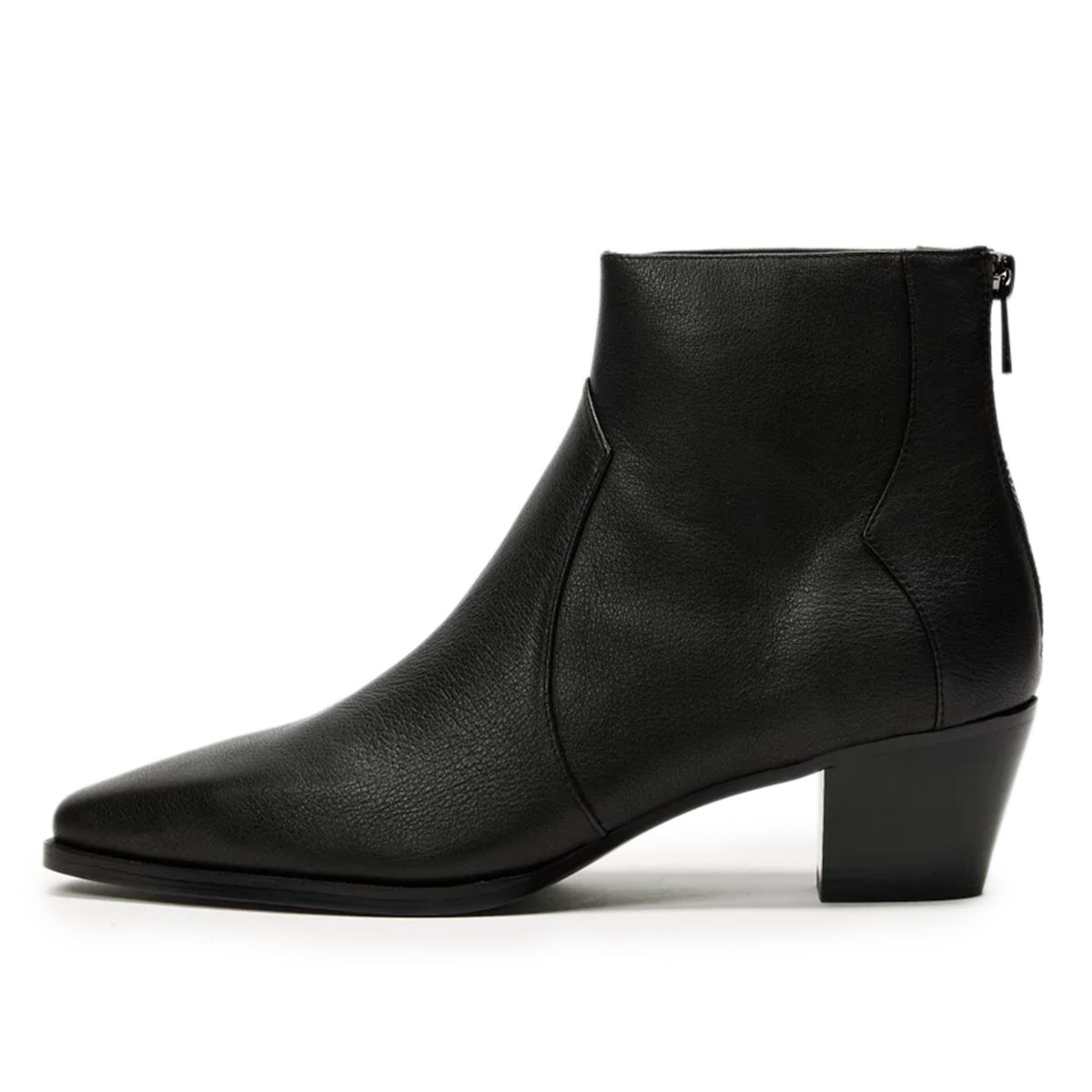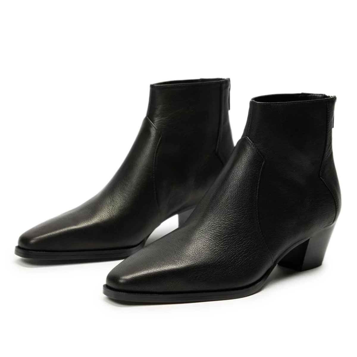 • Special Designs: Black ankle boots with classic block heel and back-zip closure.