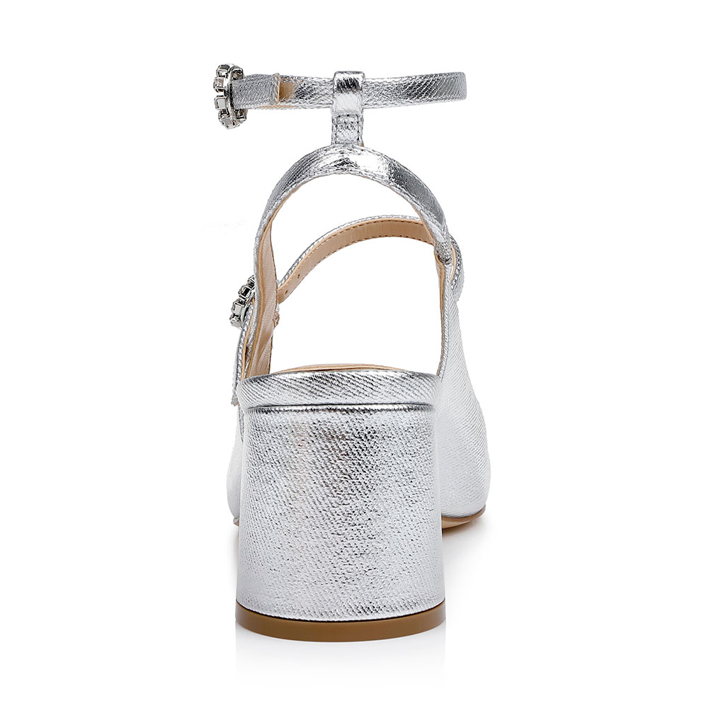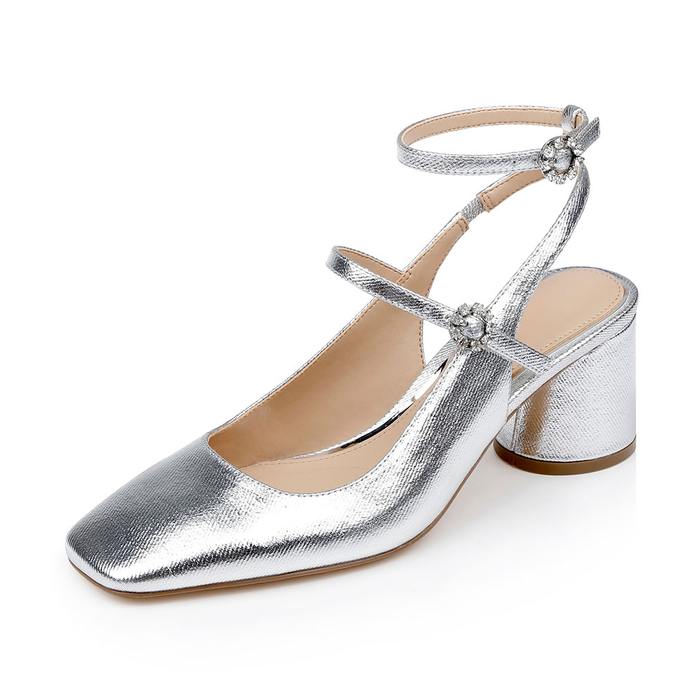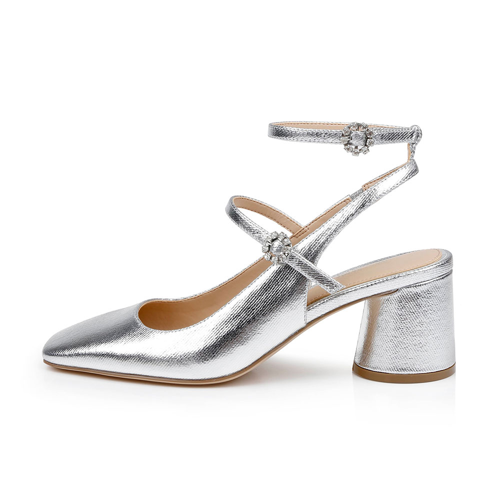 Square Toe Block Heel Mary Jane Slingback Silver Pumps with Buckle