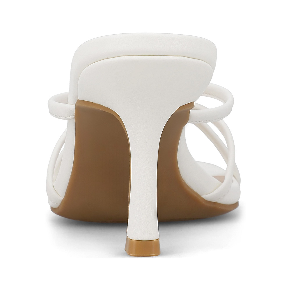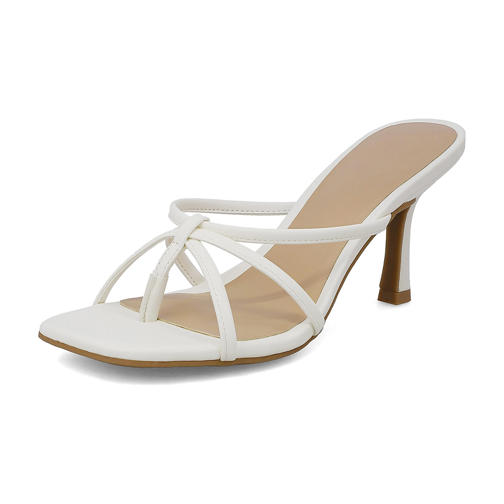 Square Toe High Heel Slip On Strappy Flip Flop White Sandals with Knot