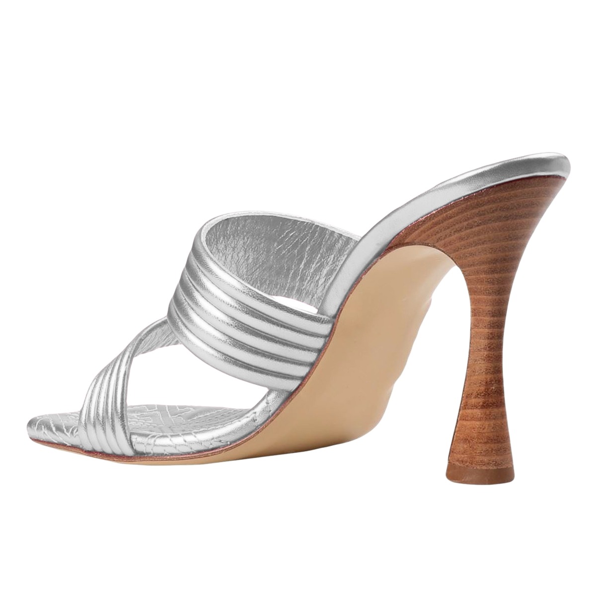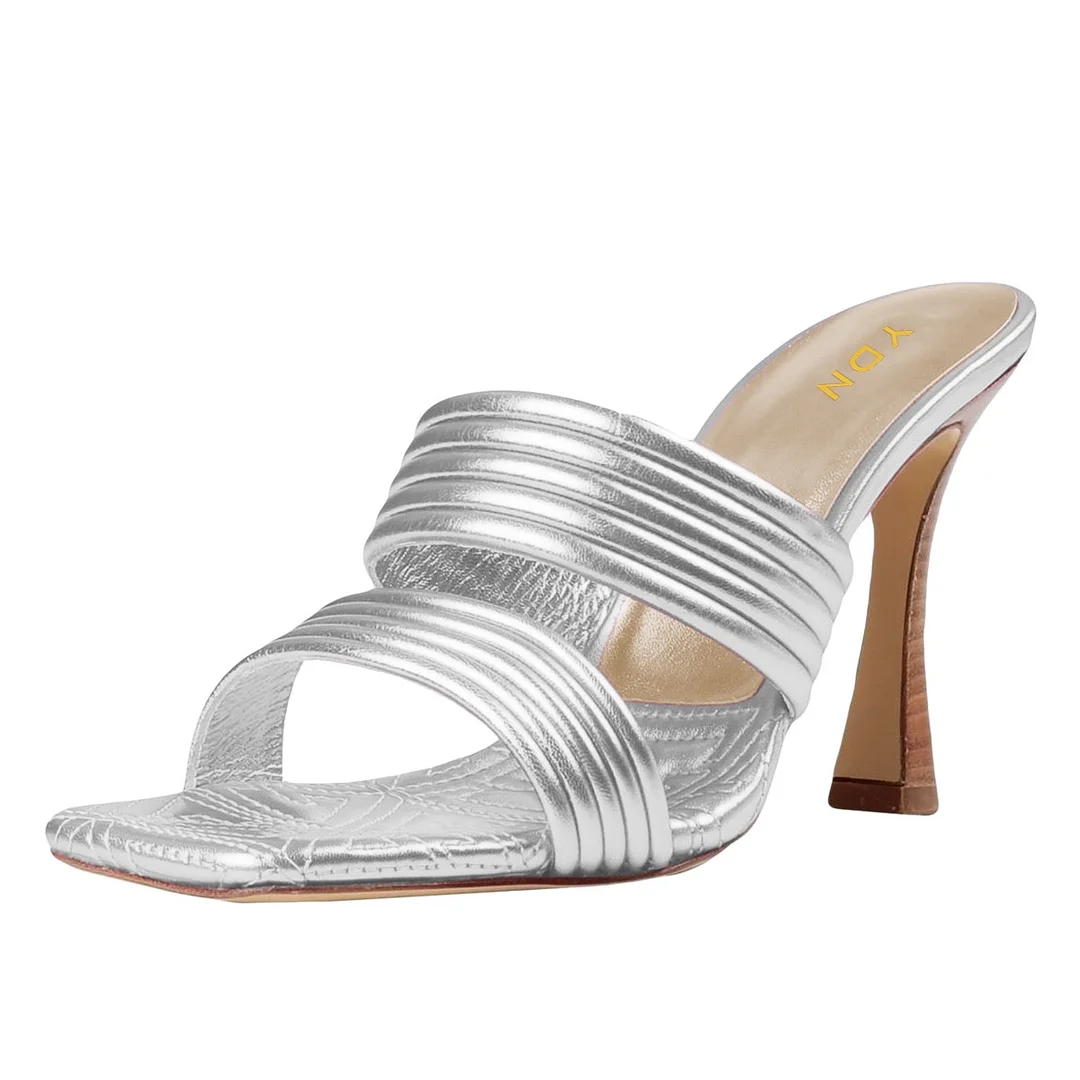 Square Toe Spool High Heeled Double Strap Metallic Silver Sandals