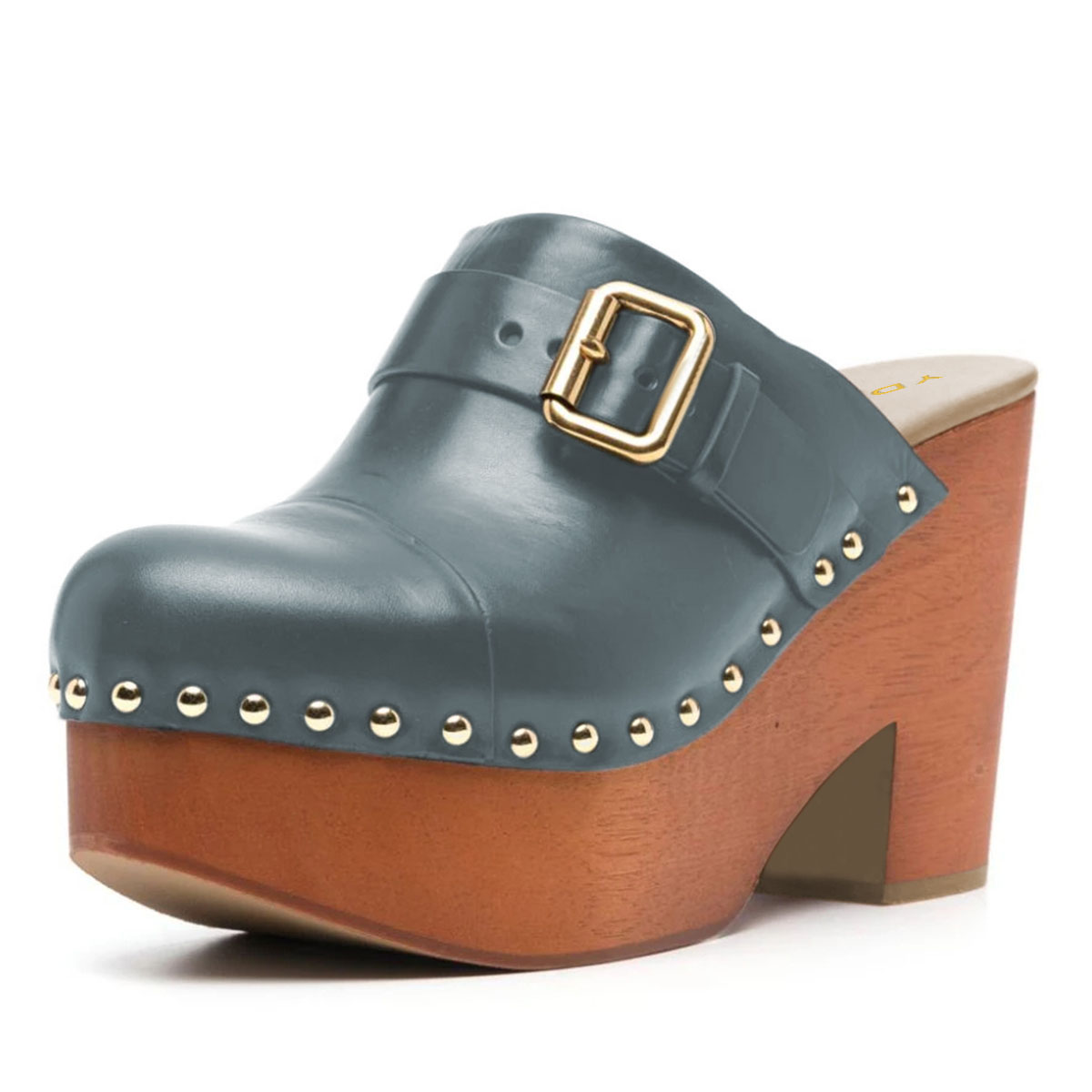 Studded Buckle Strap Round Toe Block Heel Platform Mules in Grey