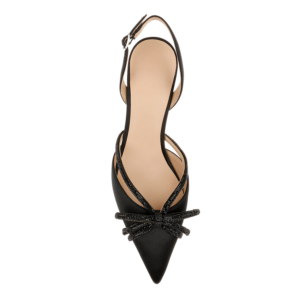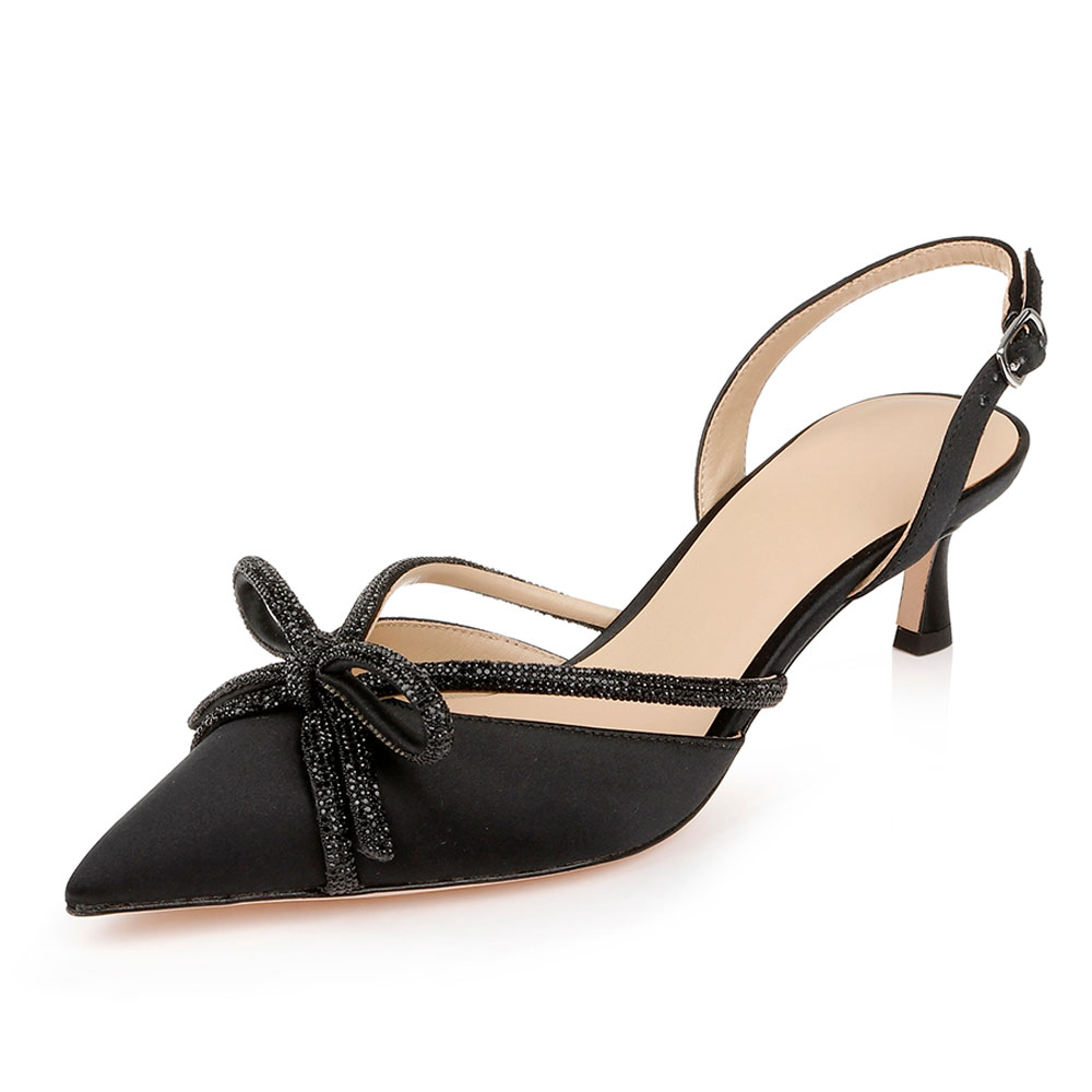 Stylish Black Satin Pointed Toe Jeweled Bow Slingback Kitten Heels