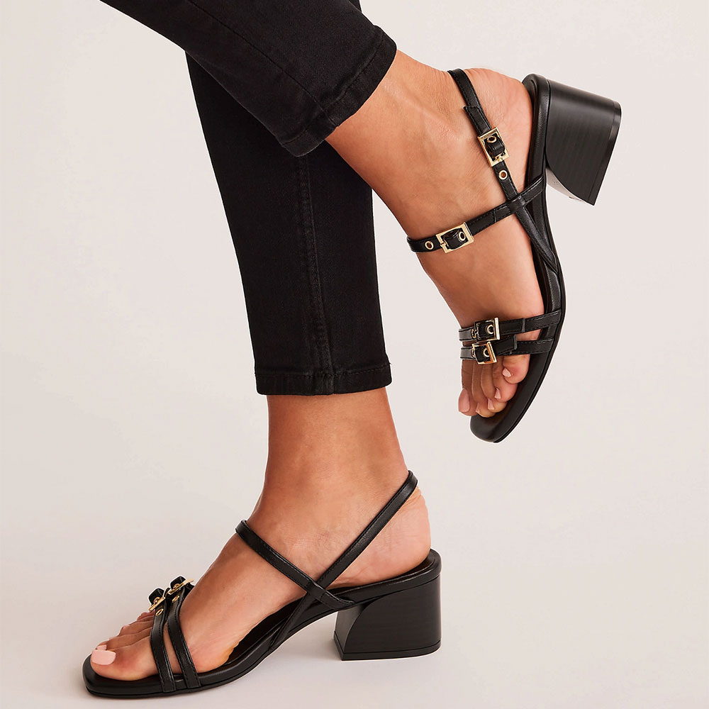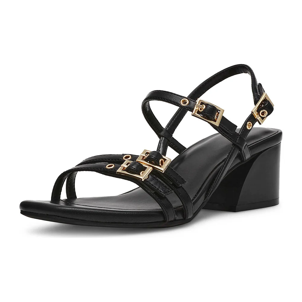 • Special Designs: These slingback sandals feature a block heel, a round toe,a grommet, with multiple strap buckles.