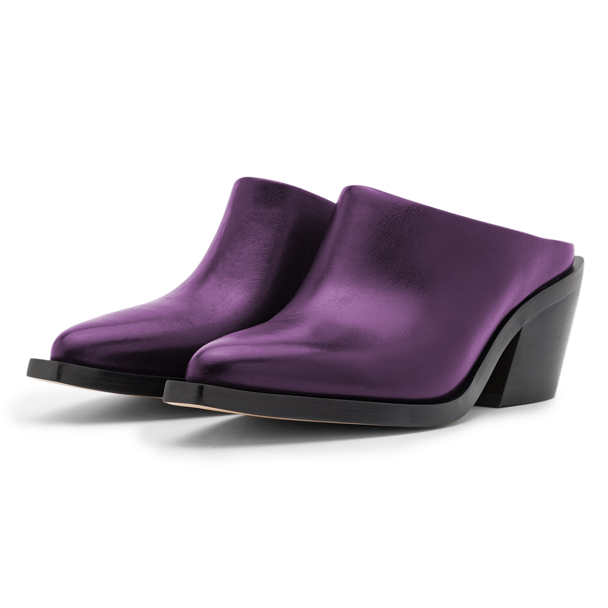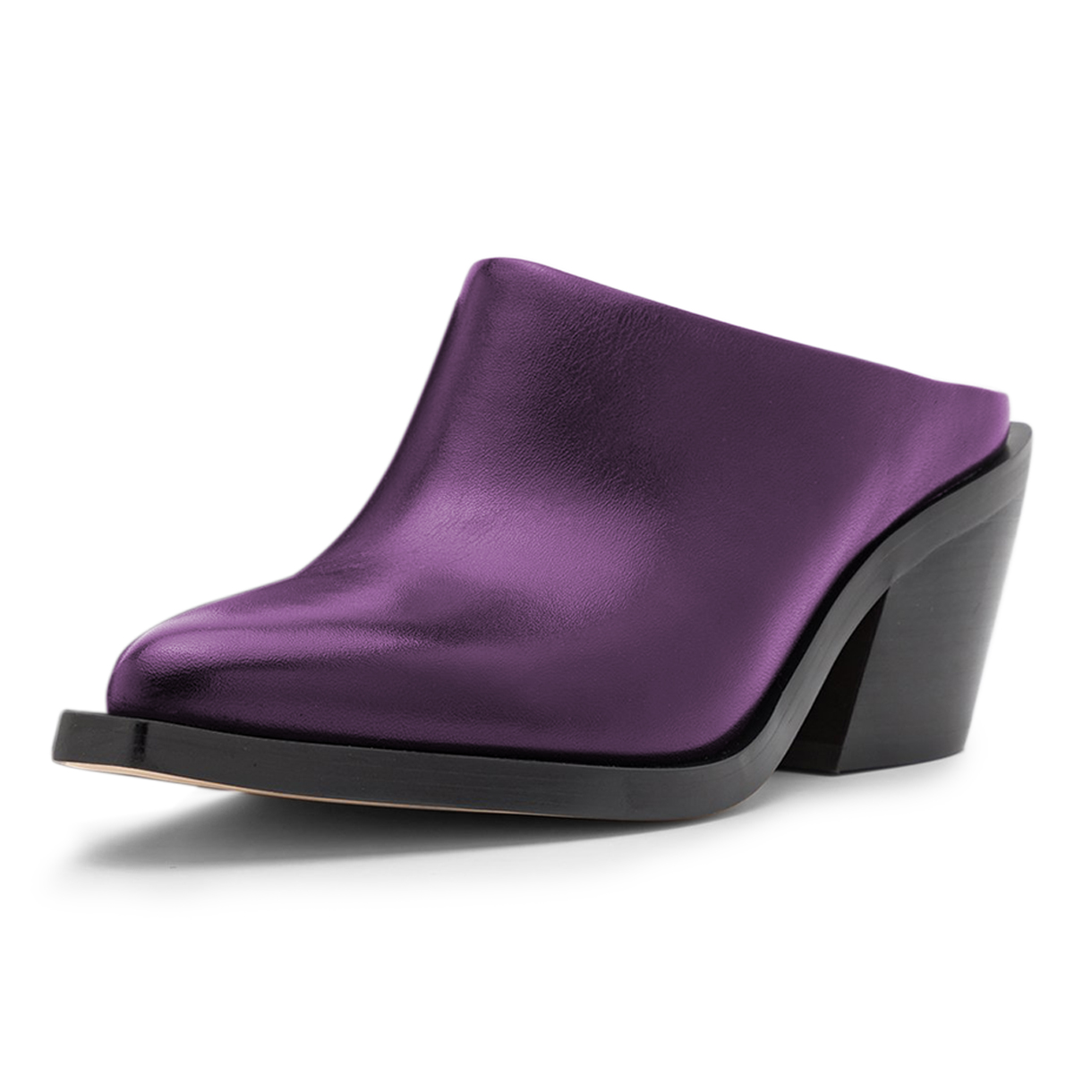 • Special Designs: Purple mules with a classic block heel and snip-toe design.
