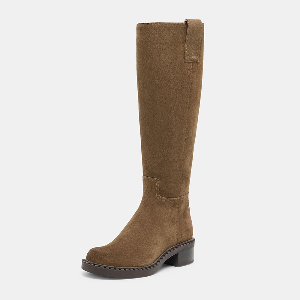Tan Block Heel Round Toe Vegan Suede Long Fashion Boots for Women
