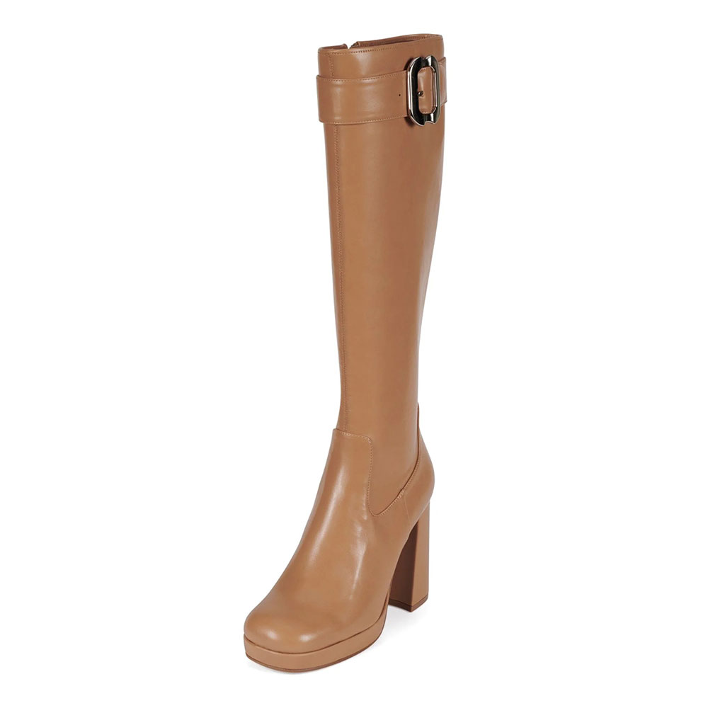 Tan Chunky High Heel Buckle Side Zipper Square Toe Boots with Platform